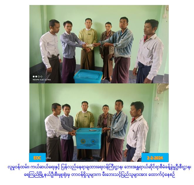 လူမှုဝန်ထမ်း၊ကယ်ဆယ်ရေးနှင့်ပြန်လည်နေရာချထားရေးဝန်ကြီးဌာန၊ဘေးအန္တရာယ်ဆိုင်ရာစီမံခန့်ခွဲမှုဦးစီးဌာန၊ ရေကြည်မြို့နယ်ဦးစီးမှုးရုံးမှ တာဝန်ရှိသူများသည် ကျုံပျော်ခရိုင်၊ အထောင်မြို့၊ အမှတ် (၃) ရပ်ကွက်၊အင်းဖျားကျေးရွာတွင် (၃၁-၁-၂၀၂၄)ရက်နေ့၌ ဖြစ်ပွားခဲ့သောမီးဘေးကြောင့် လုံးဝပျက်စီး နေအိမ်(၁)လုံးအတွက် အိမ်ဆောက်ပစ္စည်းဖိုးထောက်ပံ့ငွေ (၂၀၀,၀၀၀ိ/-)၊ အိမ်ထောင်စု(၁)စုမှ စုစုပေါင်း လူဦးရေ(၅)ဦးအတွက် ဆန်ရိက္ခာ(၇)ရက်စာထောက်ပံ့ငွေ (၁၀,၅၀၀ိ/-)၊ စုစုပေါင်း ထောက်ပံ့ငွေ (၂၁၀,၅၀၀ိ/-)နှင့် ထောက်ပံ့ငွေ(၄၆,၀၃၆/-)တန်ဖိုးရှိ ကယ်ဆယ်ရေးပစ္စည်း(၁၇)မျိုးပါ (၁)အိမ်ထောင်စာတို့အား(၁-၂-၂၀၂၄) ရက်နေ့ (၁၁း၃၀)နာရီအချိန်တွင် တာဝန်ရှိသူများနှင့်အတူ ထောက်ပံ့ပေးအပ်ခဲ့ကြောင်း သတင်းရရှိပါသည်။