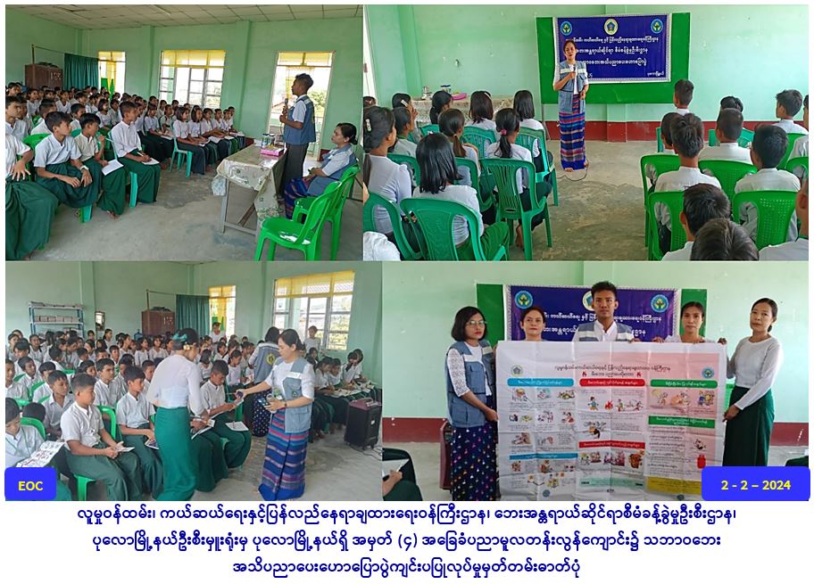 လူမှုဝန်ထမ်း၊ ကယ်ဆယ်ရေးနှင့်ပြန်လည်နေရာချထားရေးဝန်ကြီးဌာန၊ ဘေးအန္တရာယ်ဆိုင်ရာစီမံခန့်ခွဲမှုဦးစီးဌာန၊ ပုလော မြို့နယ်ဦးစီးမှူးရုံးမှ တာဝန်ရှိသူများသည် (၂-၂-၂၀၂၄)ရက်နေ့ ၊ နံနက် (၁၁:၀၀) နာရီတွင် ပုလောမြို့နယ်ရှိ အမှတ်(၄) အခြေခံ ပညာမူလတန်းလွန်ကျောင်းတွင် ကျောင်းသား/ကျောင်းသူ၊ ဆရာ/ဆရာမ (၁၀၀) ဦးခန့်အား သဘာဝဘေးအန္တရာယ်များနှင့် ပတ်သက်၍ အသိပညာပေးဟောပြောပွဲဆောင်ရွက်ခြင်း၊ သဘာဝဘေးအသိပညာပေး လက်ကမ်းစာစောင်များဖြန့်ဝေပေးခြင်း၊ ဗီနိုင်းပိုစတာပေးအပ်ခြင်းများနှင့် ကျောင်းသား/သူများအတွက် ဘောလ်ပင်များဖြန့်ဝေပေးခြင်းများ ဆောင်ရွက်ခဲ့ပါကြောင်း သတင်းရရှိပါသည်။