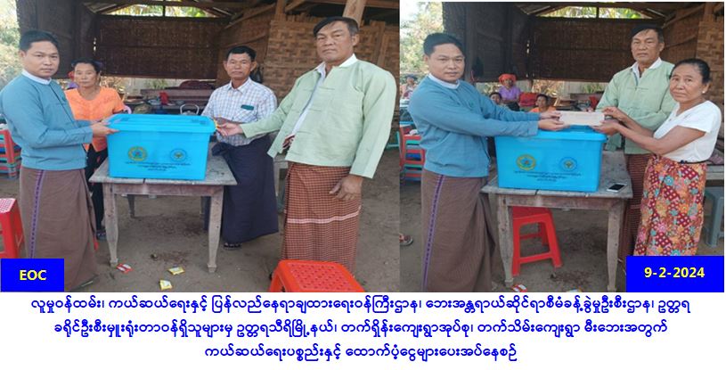 လူမှုဝန်ထမ်း၊ ကယ်ဆယ်ရေးနှင့် ပြန်လည်နေရာချထားရေးဝန်ကြီးဌာန၊ ဘေးအန္တရာယ်ဆိုင်ရာစီမံခန့်ခွဲမှု ဦးစီးဌာန၊ ပြည်ထောင်စုနယ်မြေ၊ နေပြည်တော်၊ ဥတ္တရခရိုင်ဦးစီးမှူးရုံးမှ တာဝန်ရှိသူများသည် ဥတ္တရ ခရိုင်၊ ဥတ္တရသီရိမြို့နယ်၊ တက်ရှိန်းကျေးရွာအုပ်စု၊ တက်သိမ်းကျေးရွာ၌ (၇-၂-၂၀၂၄)ရက်နေ့ (၁၆:၅၀) နာရီအချိန်တွင် ဖြစ်ပွားခဲ့သောမီးဘေးကြောင့် လုံးဝပျက်စီးနေအိမ် (၁)လုံးနှင့် တစ်စိတ်တစ်ပိုင်း နေအိမ် (၁)လုံးအတွက် အိမ်ဆောက်ပစ္စည်းဖိုးထောက်ပံ့ငွေ (၂၅၀,၀ဝဝ/-)၊ ဘေးသင့်လူဦးရေ (၁၅)ဦးအတွက် ဆန်ရိက္ခာဖိုးထောက်ပံ့ငွေ (၃၁,၅၀ဝ/-)၊ စုစုပေါင်း ထောက်ပံ့ငွေ (၂၈၁,၅၀ဝ/-)ကျပ်နှင့် (၄၆,၃၆၄/-) တန်ဖိုးရှိ ကယ်ဆယ်ရေးပစ္စည်း(၁၇)မျိုး အိမ်ထောင်စု(၁)စုစာတို့အား (၉-၂-၂၀၂၄)ရက်နေ့ (၁၁:၀၀) နာရီ အချိန်တွင် ဘေးသင့်ပြည်သူများ လက်ဝယ်အရောက် ထောက်ပံ့ပေးအပ်ခဲ့ကြောင်း သတင်းရရှိပါသည်။