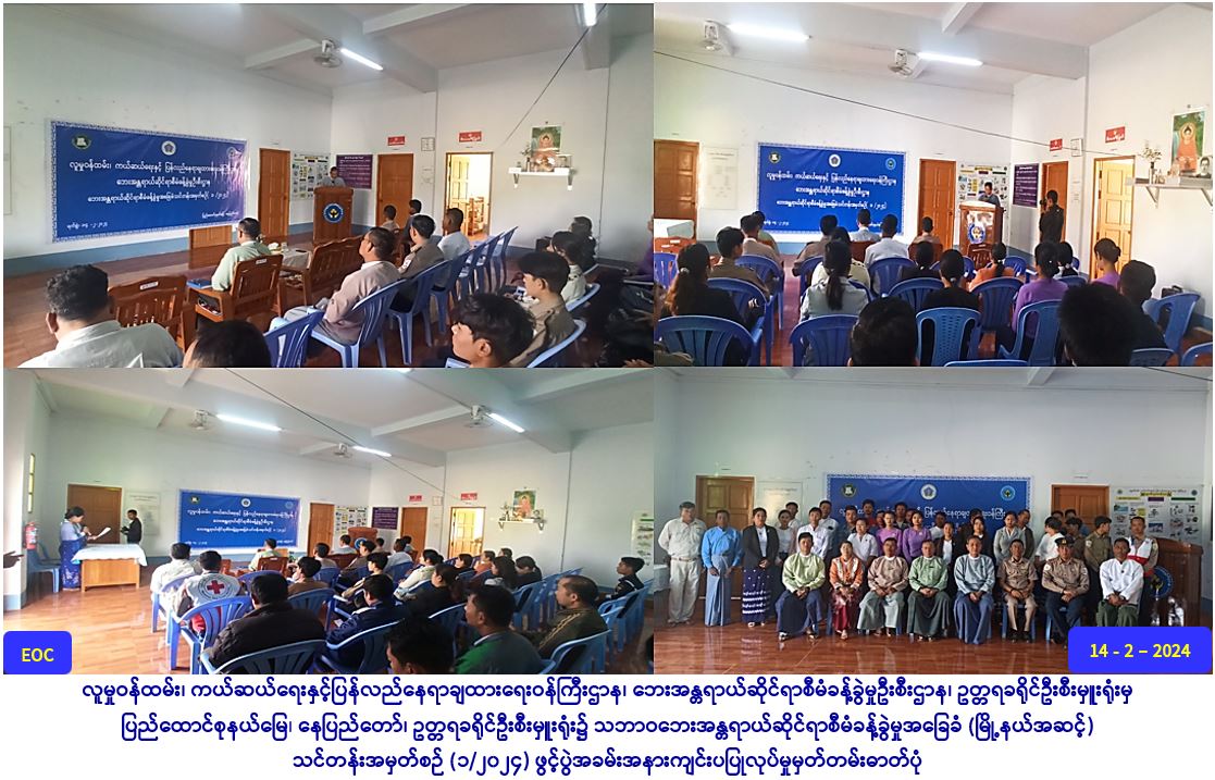 လူမှုဝန်ထမ်း၊ ကယ်ဆယ်ရေးနှင့်ပြန်လည်နေရာချထားရေးဝန်ကြီးဌာန၊ ဘေးအန္တရာယ်ဆိုင်ရာစီမံခန့်ခွဲမှုဦးစီးဌာန၊ ဥတ္တရခရိုင် ဦးစီးမှူးရုံးမှ တာဝန်ရှိသူများသည် ပြည်ထောင်စုနယ်မြေ၊ နေပြည်တော်၊ ဥတ္တရခရိုင်ဦးစီးမှူးရုံး၌ (၁၄-၂-၂၀၂၄) ရက်နေ့ နံနက် (၀၉:၃၀)နာရီအချိန်တွင် သဘာဝဘေးအန္တရာယ်ဆိုင်ရာစီမံခန့်ခွဲမှုအခြေခံ (မြို့နယ်အဆင့်) သင်တန်းအမှတ်စဉ် (၁/၂၀၂၄)ဖွင့်ပွဲ အခမ်းအနားကို ကျင်းပပြုလုပ်ခဲ့ရာ အဆိုပါအခမ်းအနားသို့ ပြည်ထောင်စုနယ်မြေ၊ နေပြည်တော်တိုင်းဦးစီးမှူး၊ ဥတ္တရခရိုင်၊ အထွေထွေအုပ်ချုပ်ရေးဦးစီးဌာနမှ ခရိုင်အုပ်ချုပ်ရေးမှူး၊ ဥတ္တရခရိုင်၊ ကြက်ခြေနီကြီးကြပ်မှုကော်မတီဥက္ကဌ ၊ ဥတ္တရသီရိမြို့နယ်၊ အထွေထွေအုပ်ချုပ်ရေးဦးစီးဌာနမှ ဒုမြို့နယ်အုပ်ချုပ်ရေးမှူး၊ ဖိတ်ကြားထားသော ဧည့်သည်တော်များ၊ ဌာနဆိုင်ရာ ဝန်ထမ်းများနှင့် သင်တန်းသား/သူစုစုပေါင်း (၆၀)ဦး တက်ရောက်ခဲ့ပါကြောင်း သတင်းရရှိပါသည်။