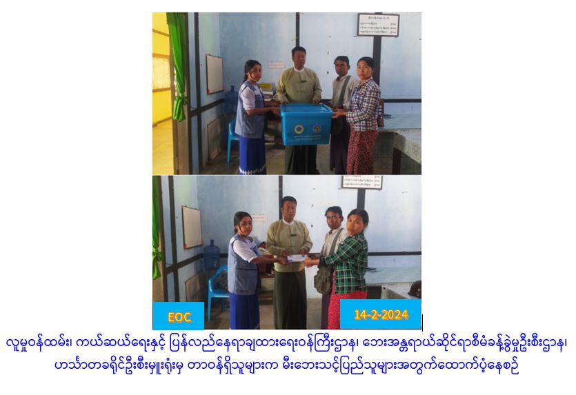 လူမှုဝန်ထမ်း၊ ကယ်ဆယ်ရေးနှင့်ပြန်လည်နေရာချထားရေးဝန်ကြီးဌာန၊ ဘေးအန္တရာယ်ဆိုင်ရာစီမံခန့်ခွဲမှု ဦးစီးဌာန၊ဟင်္သာတခရိုင်ဦးစီးမှူးရုံးမှ တာဝန်ရှိသူများသည် (၁၄-၂-၂၀၂၄) ရက်နေ့၌ ဟင်္သာတမြို့နယ်၊ အင်္ဂရမ်းအုပ်စု၊ မအူကုန်ကျေးရွာတွင် ဖြစ်ပွားခဲ့သော မီးဘေးကြောင့် လောင်ကျွမ်းအိမ်ခြေ (သစ် ၁)လုံးနှင့် (ဝါး ၁)လုံးတို့အတွက် အိမ်ဆောက်ပစ္စည်းဖိုးထောက်ပံ့ငွေ (၃၀၀,၀၀ဝိ/-)၊ စုစုပေါင်းလူဦးရေ (၈)ဦးအတွက် ဆန်ရိက္ခာဖိုးထောက်ပံ့ငွေ (၁၆,၈၀ဝိ/-)၊ စုစုပေါင်းထောက်ပံ့ငွေ (၃၁၆,၈၀ဝိ/-)နှင့် ကယ်ဆယ်ရေးပစ္စည်း (၁၆)မျိုးပါ (၂)အိမ်ထောင်စာတို့အား (၁၅-၂-၂၀၂၄)ရက်နေ့၊ (၁၅:၀၀)နာရီအချိန်တွင် မြို့နယ်စီမံအုပ်ချုပ်ရေးအဖွဲ့မှ တာဝန်ရှိသူများနှင့်အတူ ဘေးသင့်ပြည်သူများထံသို့ လက်ဝယ်အရောက် ထောက်ပံ့ပေးအပ်ခဲ့ပါကြောင်း သတင်းရရှိပါသည်။