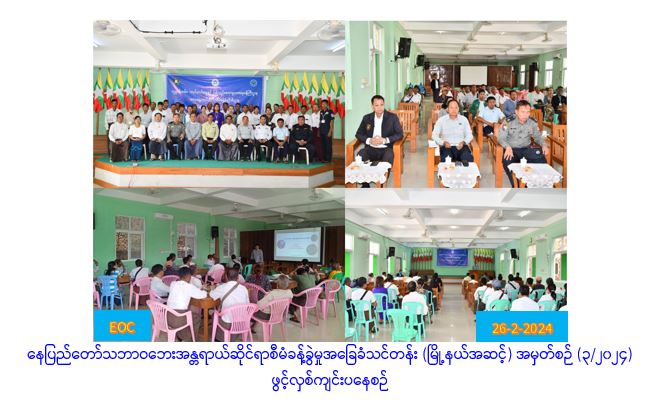 ပြည်ထောင်စုနယ်မြေ၊ နေပြည်တော်၊ ပျဉ်းမနားမြို့နယ်၌ နေပြည်တော် သဘာဝဘေးအန္တရာယ်ဆိုင်ရာ စီမံခန့်ခွဲမှုအခြေခံသင်တန်း(မြို့နယ်အဆင့်) အမှတ်စဉ်(၃/၂၀၂၄)ကို (၂၆-၂-၂၀၂၄)ရက်နေ့ နံနက်ပိုင်းက ပျဉ်းမနားမြို့နယ်၊ အထွေထွေအုပ်ချုပ်ရေးဦးစီးဌာနအစည်းအဝေးခန်းမ၌ ကျင်းပခဲ့ရာ ပျဉ်းမနားမြို့နယ်၊ သဘာဝဘေးအန္တရာယ်ဆိုင်ရာစီမံခန့်ခွဲမှုအဖွဲ့ဥက္ကဋ္ဌ ဦးမောင်မောင်သန်း၊ ဘေးအန္တရာယ်ဆိုင်ရာစီမံခန့်ခွဲ မှုဦးစီးဌာန၊ နေပြည်တော်တိုင်းဦးစီးမှူးရုံးမှ ညွှန်ကြားရေးမှူး ဦးစဝီလီဖရန့်၊ ဌာနဆိုင်ရာ တာန်ရှိသူများ နှင့် သတင်းတန်းသား၊ သင်တန်းသူများ တက်ရောက်ခဲ့ကြပြီး စုပေါင်းမှတ်တမ်းတင်ဓာတ်ပုံ ရိုက်ကူး ခဲ့ပါသည်။ အဆိုပါ နေပြည်တော်သဘာဝဘေးအန္တရာယ်ဆိုင်ရာစီမံခန့်ခွဲမှုအခြေခံသင်တန်း (မြို့နယ်အဆင့်) အမှတ်စဉ် (၃/၂၀၂၄)ကို ဖေဖော်ဝါရီလ ၂၆ ရက်နေ့မှ ၂၈ ရက်နေ့အထိ ၃ ရက်ကြာ သင်ကြား ပို့ချသွားမည်ဖြစ်ကြောင်းသတင်းရရှိပါသည်။