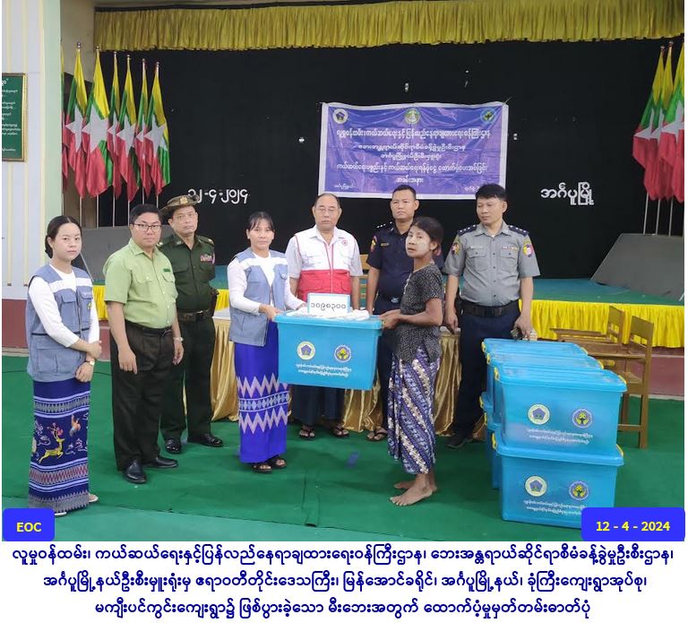 လူမှုဝန်ထမ်း၊ ကယ်ဆယ်ရေးနှင့်ပြန်လည်နေရာချထားရေးဝန်ကြီးဌာန၊ ဘေးအန္တရာယ်ဆိုင်ရာစီမံခန့်ခွဲမှုဦးစီးဌာန၊ အင်္ဂပူမြို့နယ် ဦးစီးမှူးရုံးမှ တာဝန်ရှိသူများသည် မြန်အောင်ခရိုင်၊ အင်္ဂပူမြို့နယ်၊ ခုံကြီးကျေးရွာအုပ်စု၊ မကျီးပင်ကွင်းကျေးရွာတွင် (၂၆-၃- ၂၀၂၄) နေ့ဖြစ်ပွားသော မီးလောင်မှုကြောင့် လုံးဝလောင်ကျွမ်းပျက်စီးခဲ့သောလူ နေအိမ်ခြေ (ဝါး-၇) လုံးအတွက် အိမ်ဆောက် ပစ္စည်းရန်ပုံငွေ (၇၀၀၀၀ဝိ/-) နှင့် အိမ်ထောင်စု (၇)စုမှလူဦးရေ (၂၃) ဦးတို့အတွက် ဆန်ရိက္ခာ (၇)ရက်စာရန်ပုံငွေ (၄၈၃၀ဝိ/-) သေဆုံးသူ (၁)ဦးအတွက် ထောက်ပံ့ငွေကျပ် (၃၀၀၀၀၀/-)၊ ဒဏ်ရာရသူ(၁)ဦးအတွက် ထောက်ပံ့ငွေကျပ် (၅၀၀၀၀/-)စုစုပေါင်း ထောက်ပံ့ရန်ပုံ ငွေကျပ်(၁၀၉၈၃၀၀/-) ၊ကယ်ဆယ်ရေးပစ္စည်း (၁၆)မျိုး၊ (၇)အိမ်ထောင်စာတန်ဖိုးငွေကျပ် (၃၆၃၁၂၃)၊ စုစုပေါင်း ထောက်ပံ့မှုတန်ဖိုးကျပ် (၁၄၆၁၄၂၃)နှင့် စက္ကူပုံး(၇) ပုံးတို့ကို (၁၂-၄-၂၀၂၄) နေ့၊ (၁၀:၀၀)အချိန်တွင် မြို့နယ်အထွေထွေ အုပ်ချုပ်ရေးဦးစီးဌာန၊ အစည်းအဝေးခန်းမ၌ ကယ်ဆယ်ရေးပစ္စည်းနှင့်ရန်ပုံငွေများအား မြို့နယ်စီမံအုပ်ချုပ်ရေးအဖွဲ့ ဥက္ကဌ၊ အဖွဲ့ဝင်(၁)နှင့် မီးသတ်ဦးစီးဌာန၊ မြို့နယ်ကြက်ခြေနီအသင်းမှ တာဝန်ရှိသူများနှင့်အတူ ဘေးသင့်ပြည်သူများလက်ဝယ် အရောက် ထောက်ပံ့ပေးအပ်ခဲ့ပါကြောင်း သတင်းရရှိပါသည်။