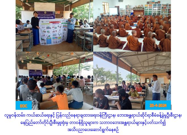 လူမှုဝန်ထမ်းကယ်ဆယ်ရေးနှင့်ပြန်လည်နေရာချထားရေးဝန်ကြီးဌာန၊ ဘေးအန္တရာယ်ဆိုင်ရာစီမံခန့်ခွဲမှုဦးစီးဌာန၊ ပြည်ထောင်စုနယ်မြေ၊ နေပြည်တော်တိုင်းဦးစီးမှူးရုံးမှ တာဝန်ရှိသူများသည် (၂၅-၄-၂၀၂၄)ရက်နေ့၊ (၁၀း၀၀)အချိန်မှ (၁၁း၃၀) အချိန်ထိ ဇေယျာသီရိမြို့နယ်၊ ရွာသစ်ကြီးပရိယတ္တိစာသင်တိုက်၌ သင်တန်းသား(ကိုရင်) (၇၀)ဦး၊ (၁၂း၀၀)အချိန်မှ (၁၃း၃၀)အချိန်ထိ၊ ဆန္ဒဆာရာဓမ္မစင်တာ(အထက်တန်း)ကျောင်းတွင် ကျောင်းသား/ သူ(၅၀)ဦးနှင့် (၁၄း၀၀)အချိန်မှ (၁၅း၃၀)အချိန်ထိ၊ ဆန္ဒဆာရာဓမ္မစင်တာ(အလယ်တန်း)ကျောင်းတွင် ကျောင်းသား/ သူ(၁၀၀)ဦး၊ စုစုပေါင်း ကျောင်းသား/သူ (၂၂၀)ဦးတို့အား သဘာဝဘေးအန္တရာယ်များနှင့်ပတ်သက်၍ အသိပညာပေးဟောပြောပွဲကို ကျင်းပပြုလုပ်ခဲ့ပြီး သဘာဝဘေးအသိပညာပေး လက်ကမ်းစာစောင်၊ နံရံကပ်ပိုစတာများ၊ ဗီနိုင်းပိုစတာများ၊ ခဲတံနှင့် ဗလာစာအုပ်များ ဖြန့်ဝေပေးခဲ့ကြောင်း သတင်းရရှိပါသည်။