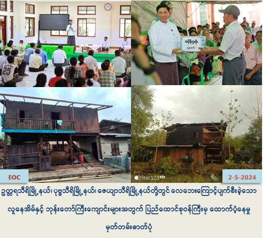 လူမှုဝန်ထမ်း၊ ကယ်ဆယ်ရေးနှင့် ပြန်လည်နေရာချထားရေးဝန်ကြီးဌာန၊ ဘေးအန္တရာယ်ဆိုင်ရာစီမံ ခန့်ခွဲမှုဦးစီးဌာန၊ ဥတ္တရခရိုင်ဦးစီးမှူးရုံးမှ တာဝန်ရှိသူများသည် ပြည်ထောင်စုနယ်မြေ၊ နေပြည်တော်၊ ဥတ္တရသီရိမြို့နယ် ၊ ပုဗ္ဗသီရိမြို့နယ်နှင့် ဇေယျာသီရိမြို့နယ်တို့၌ (၂-၅-၂၀၂၄) ရက်နေ့ (၁၇:၀၀) အချိန် ခန့်တွင် ဖြစ်ပွားခဲ့သော လေပြင်းဘေးကြောင့် ပျက်စီးခဲ့သည့် ပြိုကျနေအိမ် (၂၄)လုံး၊ အမိုးလန်နေအိမ် (၁၅၆) လုံး၊ ဘုန်းတော်ကြီးကျောင်း (၂)ကျောင်းတို့အတွက် အိမ်ဆောက်ပစ္စည်းဖိုးထောက်ပံ့ငွေ (၁၀,၃၅၀,၀၀၀/-)၊ ဘေးသင့်လူဦးရေ(၇၂၅)ဦးအတွက် ဆန်ရိက္ခာဖိုးထောက်ပံ့ငွေ(၁,၅၂၂,၅၀၀/-)၊ စုစုပေါင်းထောက်ပံ့မှုငွေ (၁၁,၈၇၂,၅၀၀/-)နှင့် (၄၆,၀၃၆/-)တန်ဖိုးရှိ ကယ်ဆယ်ရေးပစ္စည်း စုစုပေါင်း (၂၄)အိမ်ထောင်စုစာတို့အား (၃-၅-၂၀၂၄)ရက်နေ့တွင် လူမှု၀န်ထမ်း၊ ကယ်ဆယ်ရေးနှင့် ပြန်လည်နေရာ ချထားရေး၀န်ကြီးဌာန၊ ပြည်ထောင်စု၀န်ကြီး၊ ဒေါက်တာစိုး၀င်း၊ နေပြည်တော် သဘာ၀ဘေးအန္တရာယ် ဆိုင်ရာစီမံခန့်ခွဲမှုအဖွဲ့ဥက္ကဋ္ဌ၊ ဦးသန်းထွန်းဦး၊ နေပြည်တော်ကောင်စီအဖွဲ့၀င်များ၊ ဘေးအန္တရာယ်ဆိုင်ရာ စီမံခန့်ခွဲမှုဦးစီးဌာန၊ ညွှန်ကြားရေးမှူးချုပ်၊ နေပြည်တော် ဘေးအန္တရာယ်ဆိုင်ရာစီမံခန့်ခွဲမှုဦးစီးဌာနမှ ညွှန်ကြားရေမှူးနှင့် တာ၀န်ရှိသူများသည် ဘေးသင့်ပြည်သူများလက်ဝယ်သို့ သွားရောက်ထောက်ပံ့ခဲ့ပါကြောင်း သတင်းရရှိပါသည်။