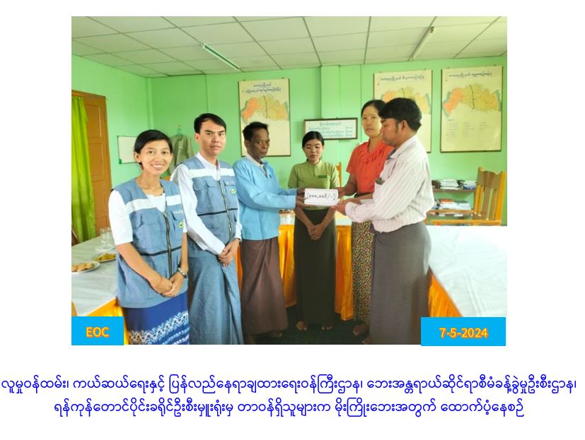 လူမှုဝန်ထမ်း၊ ကယ်ဆယ်ရေးနှင့် ပြန်လည်နေရာချထားရေးဝန်ကြီးဌာန၊ ဘေးအန္တရာယ်ဆိုင်ရာစီမံခန့်ခွဲမှုဦးစီးဌာန၊ ရန်ကုန်တောင်ပိုင်းခရိုင်ဦးစီးမှူးရုံးမှ တာဝန်ရှိသူများသည် (၅-၅-၂၀၂၄) ရက်နေ့၊ (၁၅:၁၀) နာရီအချိန်ခန့်၌ တွံ့တေးခရိုင်၊ကော့မှူးမြို့နယ်၊ သခွတ်ပင်ကျေးရွာအုပ်စု၊ သခွတ်ပင်ကျေးရွာတွင် မသော်တာဇင်၊ (၂၅)နှစ်၊(ဘ) ဦးအောင်ဇော်မိုး၊ ရေလုပ်ငန်းလုပ်ကိုင်သူသည် ၎င်း၏ နေအိမ်မြောက်ဘက် ပေ(၁၀၀)ခန့်အကွာရှိ သမှဲ့ပင်အောက်တွင် ငါးဖမ်းပိုက်အားဖာနေစဉ် မိုးကြိုးထိမှန်၍ သေဆုံးခဲ့ပါသဖြင့် အဆိုပါမိုးကြိုးပစ်သေဆုံးခဲ့သူအတွက် ထောက်ပံ့ငွေ (၃၀၀,၀၀ဝိ/-)အား (၇-၅-၂၀၂၄) ရက်နေ့၊ နေ့လည်(၁၁း၅၀) နာရီအချိန်တွင် သေဆုံးသူ၏ မိသားစုများလက်ဝယ်အရောက် သွားရောက်ထောက်ပံ့ပေးအပ်ခဲ့ကြောင်း သတင်းရရှိပါသည်။