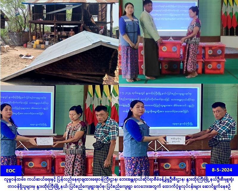 လူမှုဝန်ထမ်း၊ ကယ်ဆယ်ရေးနှင့် ပြန်လည်နေရာချထားရေးဝန်ကြီးဌာန၊ ဘေးအန္တရာယ်ဆိုင်ရာစီမံခန့်ခွဲမှု ဦးစီးဌာန၊ မန္တလေးတိုင်းဒေသကြီး၊ မြင်းခြံခရိုင်၊ နွားထိုးကြီးမြို့နယ်ဦးစီးမှူးရုံးမှ တာဝန်ရှိသူများသည် နွားထိုးကြီးမြို့နယ်၊ ပြင်စည်ကျေးရွာအုပ်စု၊ ပြင်စည်ကျေးရွာ၌ (၁-၅-၂၀၂၄) ရက်နေ့၊ (၁၉:၁၅) နာရီ အချိန်ခန့်တွင် မိုးသက်လေပြင်းတိုက်ခတ်မှုကြောင့် ပြိုကျပျက်စီးလူနေအိမ် (၂၀) လုံး၊ တစ်စိတ်တစ်ပိုင်း ပျက်စီးလူနေအိမ် (၈၇) လုံး၊ တစ်စိတ်တစ်ပိုင်းပျက်စီး ဘုန်းတော်ကြီးကျောင်း (၃) ကျောင်းတို့အတွက် အိမ်/ကျောင်းဆောက်ပစ္စည်းဖိုးငွေ (၆,၀၈၉,၀ဝဝ/-)၊ အိမ်ထောင်စု (၁၀၇) စုမှ စုစုပေါင်းဘေးသင့်လူဦးရေ (၄၃၁) ဦးတို့အတွက် ဆန်ရိက္ခာဖိုးငွေ (၇) ရက်စာ (၉၀၅,၁၀ဝ/-)၊ ပြိုကျပျက်စီးနေအိမ် (၂၀) လုံးမှ အိမ်ထောင်စု (၂၀) စုတို့အတွက် ကယ်ဆယ်ရေးပစ္စည်း (၁၆) မျိုး (၂၀) အိမ်ထောင်စာ တန်ဖိုးငွေ (၁,၂၀၈,၂၀၆/-) ကျပ်တို့အား (၈-၅-၂၀၂၄)ရက်နေ့၊ (၁၄:၃၀) နာရီအချိန်တွင် နွားထိုးကြီးမြို့နယ်၊ အထွေ ထွေအုပ်ချုပ်ရေးဦးစီးဌာန၌ ဘေးသင့်ပြည်သူများလက်ဝယ်အရောက် ထောက်ပံ့ပေးအပ်ခဲ့ကြောင်း သတင်းရရှိပါသည်။