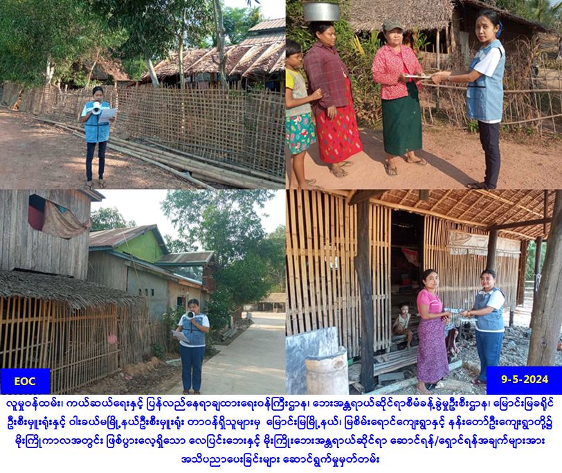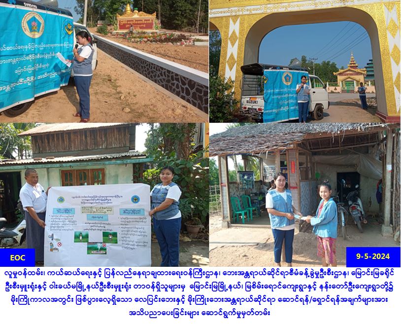 လူမှုဝန်ထမ်း၊ ကယ်ဆယ်ရေးနှင့် ပြန်လည်နေရာချထားရေးဝန်ကြီးဌာန၊ ဘေးအန္တရာယ်ဆိုင်ရာစီမံခန့်ခွဲမှု ဦးစီးဌာန၊ မြောင်းမြခရိုင်ဦးစီးမှူးရုံးနှင့် ဝါးခယ်မမြို့နယ်ဦးစီးမှူးရုံးမှ တာဝန်ရှိသူများသည် (၉-၅-၂၀၂၄) ရက်နေ့တွင် မြောင်းမြမြို့နယ်၊ မြစိမ်းရောင်ကျေးရွာနှင့် နန်းတော်ဦးကျေးရွာတို့၌ မိုးကြိုကာလအတွင်း ဖြစ်ပွားလေ့ရှိသော လေပြင်းဘေးအန္တရာယ်နှင့် မိုးကြိုးဘေးအန္တရာယ်ဆိုင်ရာ ဆောင်ရန်/ရှောင်ရန် အချက် များအား ရပ်ကွက်၊ ကျေးရွာနေ ပြည်သူများသိရှိစေရန်အတွက် လိုက်လံနှိုးဆော်အသိပညာပေးခြင်း၊ ဗီနိုင်းပိုစတာနှင့် လက်ကမ်းစာစောင် ဖြန့်ဝေပေးခြင်းများ ဆောင်ရွက်ခဲ့ပါကြောင်း သတင်းရရှိပါသည်။