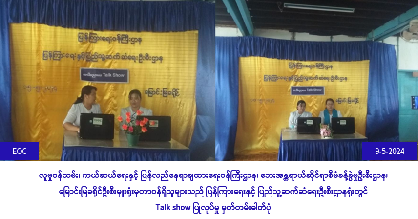 လူမှုဝန်ထမ်း၊ ကယ်ဆယ်ရေးနှင့် ပြန်လည်နေရာချထားရေးဝန်ကြီးဌာန၊ ဘေးအန္တရာယ်ဆိုင်ရာစီမံခန့်ခွဲမှုဦးစီးဌာန၊ မြောင်းမြခရိုင်ဦးစီးမှူးရုံးမှ တာဝန်ရှိသူများသည် (၉-၅-၂၀၂၄)ရက်နေ့တွင် မြောင်းမြခရိုင် ပြန်ကြား ရေးနှင့် ပြည်သူ့ဆက်ဆံရေးဦးစီးဌာနရုံး၌ မိုးကြိုကာလတွင် ဖြစ်ပွားတတ်သောဘေးများနှင့် ပတ်သက်၍ လိုက်နာဆောင်ရွက်သင့်သည့်အချက်များကို ပြည်သူများ အသိပညာဗဟုသုတရရှိစေရန်နှင့် အသက်အိုးအိမ်စည်းစိမ်များ ပျက်စီးဆုံးရှုံးမှုလျော့နည်းအောင် Talk Show အစီအစဉ်ဖြင့် ဆောင်ရွက်ခဲ့ကြပါကြောင်းသတင်းရရှိပါသည်။