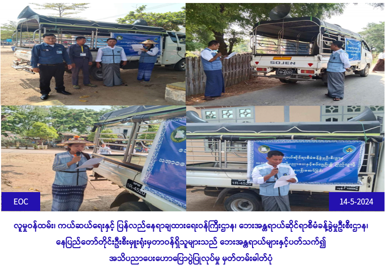လူမှုဝန်ထမ်း၊ ကယ်ဆယ်ရေးနှင့်ပြန်လည်နေရာချထားရေးဝန်ကြီးဌာန၊ ဘေးအန္တရာယ်ဆိုင်ရာစီမံခန့်ခွဲမှု ဦးစီးဌာန၊ ပြည်ထောင်စုနယ်မြေ၊ နေပြည်တော်တိုင်းဦးစီးမှူးရုံးမှ တာဝန်ရှိသူများသည် (၁၄-၅-၂၀၂၄) ရက်နေ့၊ နံနက်(၀၉:၀၀) အချိန်တွင် ဇေယျာသီရိမြို့နယ်အတွင်းရှိ ကျောက်ချက်၊ ဝဲကြီး၊ ရုံးပင်ဇောင်း၊ သာယာကုန်း၊ ရွာသစ်ကြီး၊ စည်ပင်သာယာ၊ ကျည်တောင်ခေါမ၊ သဲကျွန်း၊ မွန်းတည့်ခွင်၊ တံတားဦး၊ ခါးပြတ် ကျေးရွာများ၌ ယခုကာလတွင်ဖြစ်ပေါ်တတ်သည့် မိုးကြိုးဘေးအန္တရာယ်၊ လျှပ်စီးဘေးအန္တရာယ်နှင့် လေပြင်း ဘေးအန္တရာယ် ကြိုတင်ပြင်ဆင်ရေးနှင့်စပ်လျဉ်း၍ ဆောင်ရန်/ ရှောင်ရန်အချက်များအား ပြည်သူသို့ အသိပညာပေးလိုက်လံနှိုးဆော်မှုများ ဆောင်ရွက်ခဲ့ပါကြောင်း သတင်းရရှိပါသည်။