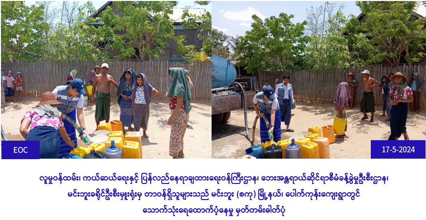 လူမှုဝန်ထမ်း၊ ကယ်ဆယ်ရေးနှင့် ပြန်လည်နေရာချထားရေးဝန်ကြီးဌာန၊ ဘေးအန္တရာယ်ဆိုင်ရာစီမံခန့်ခွဲမှု ဦးစီးဌာန၊ မင်းဘူးခရိုင်ဦးစီးမှူးရုံးမှ တာဝန်ရှိသူများသည် (၁၇-၅-၂၀၂၄) ရက်နေ့တွင် သောက်သုံးရေ လိုအပ်လျက်ရှိသည့် မင်းဘူး (စကု) မြို့နယ်၊ ပေါက်ကုန်းကျေးရွာရှိ အိမ်ထောင်စု (၁၂၂) စုမှ လူဦးရေ (၄၇၉) ဦးတို့အတွက် သောက်သုံးရေဂါလံ (၄,၀၀၀) အား သွားရောက်လှူဒါန်းခဲ့ကြောင်း သတင်းရရှိပါသည်။