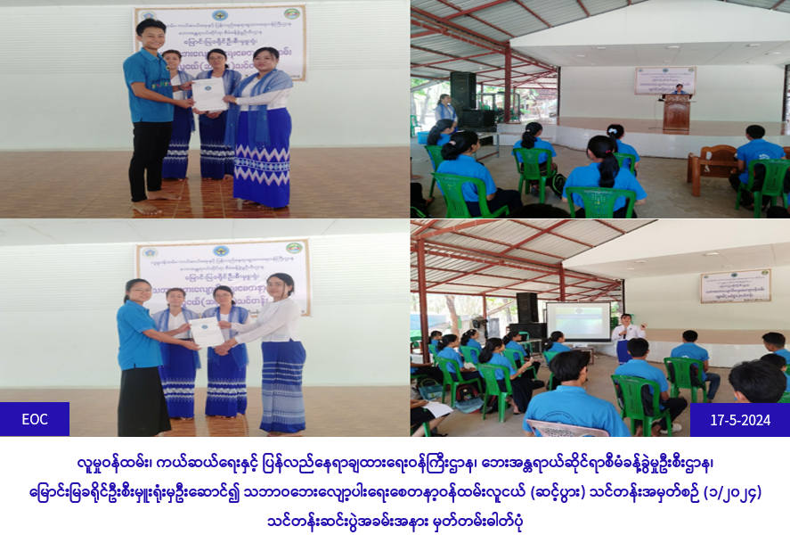 လူမှုဝန်ထမ်း၊ ကယ်ဆယ်ရေးနှင့် ပြန်လည်နေရာချထားရေးဝန်ကြီးဌာန၊ ဘေးအန္တရာယ်ဆိုင်ရာစီမံခန့်ခွဲမှု ဦးစီးဌာန၊ မြောင်းမြခရိုင်ဦးစီးမှူးရုံးမှ ဦးဆောင်၍ (၁၄-၅-၂၀၂၄) မှ (၁၇-၅-၂၀၂၄) အထိ (၄) ရက်ကြာ သဘာဝဘေးလျော့ပါးရေးစေတနာ့ဝန်ထမ်းလူငယ် (ဆင့်ပွား)သင်တန်း အမှတ်စဉ် (၁/၂၀၂၄) ကို သင်တန်းသား/သူ (၃၀) ဦးတို့အား သင်ကြားပို့ချပေးခဲ့ပြီး သင်တန်းဆင်းပွဲ အခမ်းအနားကို (၁၇-၅-၂၀၂၄) ရက်နေ့ ညနေ (၁၆း၄၅) အချိန်တွင် ပြုလုပ်ပြီးစီးခဲ့ပါကြောင်း သတင်းရရှိပါသည်။