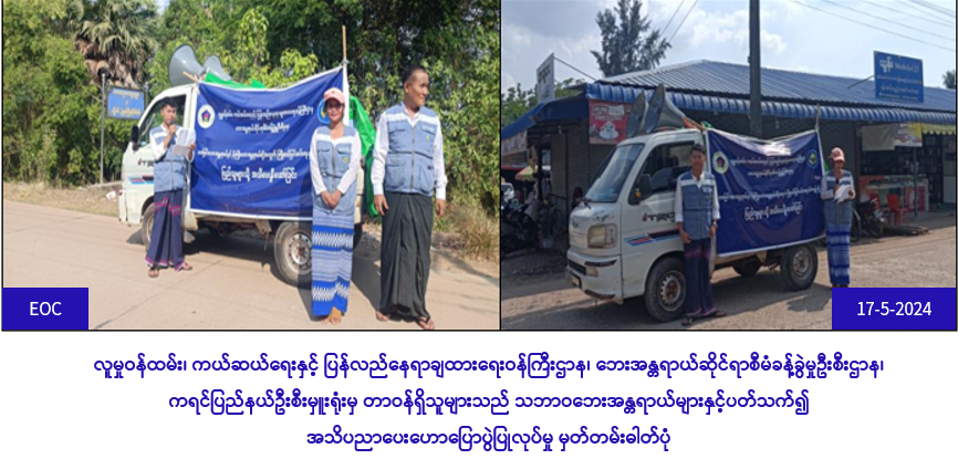 လူမှုဝန်ထမ်း၊ ကယ်ဆယ်ရေးနှင့် ပြန်လည်နေရာချထားရေးဝန်ကြီးဌာန၊ ဘေးအန္တရာယ်ဆိုင်ရာစီမံခန့်ခွဲမှုဦးစီးဌာန၊ ကရင်ပြည်နယ်ဦးစီးမှူးရုံးမှ တာဝန်ရှိသူများသည် (၁၆-၅-၂၀၂၄) ရက်နေ့နှင့် (၁၇-၅-၂၀၂၄) ရက်နေ့တို့တွင် ဘားအံမြို့နယ်အတွင်းရှိ ရပ်ကွက်၊ ကျေးရွာများနှင့် ဈေးများအတွင်း လေပြင်းဘေးနှင့် မိုးကြိုးဘေး အန္တရာယ်ဆိုင်ရာ ဆောင်ရန်/ ရှောင်ရန်များကို ပြည်သူများသိရှိနိုင်စေရန်အတွက် လှည့်လည် နှိုးဆော်ခဲ့ကြောင်း သတင်းရရှိပါသည်။