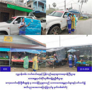 လူမှုဝန်ထမ်း၊ ကယ်ဆယ်ရေးနှင့် ပြန်လည်နေရာချထားရေးဝန်ကြီးဌာန၊ ဘေးအန္တရာယ်ဆိုင်ရာစီမံခန့်ခွဲမှုဦးစီးဌာန၊ ကော့သောင်းခရိုင်ဦးစီးမှူးရုံးမှ တာ၀န်ရှိသူများသည် (၂၂-၅-၂၀၂၄) ရက်နေ့တွင် ကော့သောင်း မြို့နယ်၊ ရွှေပြည်စိုးကျေးရွာနှင့် (၁၀) မိုင်ကျေးရွာတို့၌ မိုးကြိုကာလအတွင်း ဖြစ်ပွားလေ့ရှိသော လေပြင်း ဘေးအန္တရာယ်နှင့် မိုးကြိုးဘေးအန္တရာယ်ဆိုင်ရာ ဆောင်ရန်/ရှောင်ရန်အချက်များအား ပြည်သူများ သိရှိ စေရန်အတွက် လိုက်လံနှိုးဆော်အသိပညာပေးခြင်း၊ လက်ကမ်းစာစောင်များဖြန့်ဝေခြင်းတို့ ဆောင်ရွက်ခဲ့ ကြောင်းသတင်းရရှိပါသည်။