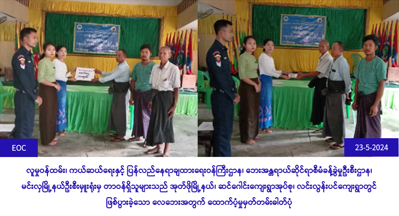 လူမှုဝန်ထမ်း၊ ကယ်ဆယ်ရေးနှင့် ပြန်လည်နေရာချထားရေးဝန်ကြီးဌာန၊ ဘေးအန္တရာယ်ဆိုင်ရာစီမံခန့်ခွဲမှုဦးစီးဌာန၊ မင်းလှမြို့နယ်ဦးစီးမှူးရုံးမှတာဝန်ရှိသူများသည် အုတ်ဖိုမြို့နယ်၊ ဆင်ဂေါင်းကျေးရွာအုပ်စု၊ လင်းလွန်းပင်ကျေးရွာ၌ (၂၀-၅-၂၀၂၄) ရက်နေ့ (၂၀း၃၀)နာရီအချိန်တွင် ဖြစ်ပွားခဲ့သောလေဘေးကြောင့် ပျက်စီးခဲ့သောအမိုးလန်နေအိမ်(၂)လုံးတို့အတွက် အိမ်ဆောက်ပစ္စည်းဖိုးထောက်ပံ့ငွေ(၁၀၀,၀၀ဝိ/-)၊ လူဦးရေ (၅) ဦးအတွက် ဆန်ရိက္ခာဖိုးထောက်ပံ့ငွေ (၁၀,၅၀ဝိ/-) စုစုပေါင်းထောက်ပံ့ငွေ (၁၁၀,၅၀ဝိ/-) အား (၂၃-၅-၂၀၂၄) ရက်နေ့ (၁၂း၀၀) နာရီအချိန်တွင် မြို့နယ်အထွေထွေအုပ်ချုပ်ရေးဦးစီးဌာန အစည်းအဝေးခန်းမ၌ မြို့နယ်တာဝန်ရှိသူများနှင့်အတူ ဘေးသင့်ပြည်သူများလက်ဝယ်သို့ သွားရောက်ထောက်ပံ့ခဲ့ပါကြောင်း သတင်းရရှိပါသည်။