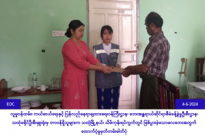 လူမှုဝန်ထမ်း၊ ကယ်ဆယ်ရေးနှင့် ပြန်လည်နေရာချထားရေးဝန်ကြီးဌာန၊ ဘေးအန္တရာယ်ဆိုင်ရာစီမံခန့်ခွဲမှုဦးစီးဌာန၊ သထုံခရိုင်ဦးစီးမှူးရုံးမှ တာဝန်ရှိသူများသည် (၃-၆-၂၀၂၄) ရက်နေ့ (၁၉း၁၀)နာရီ အချိန်ခန့်တွင် သထုံမြို့နယ်၊ သိမ်ကုန်းရပ်ကွက်၌ လေပြင်းတိုက်ခတ်မှုကြောင့် ပျက်စီးခဲ့သော အမိုးလန်နေအိမ် (၅) လုံးအတွက် အိမ်ဆောက်ပစ္စည်းဖိုးထောက်ပံ့ငွေ (၁၂၀,၀၀၀ိ/-) နှင့် ဘေးသင့်လူဦးရေ (၁၆) ဦးအတွက် (၇) ရက်စာ ဆန်ရိက္ခာဖိုးထောက်ပံ့ငွေ( ၃၃,၆၀၀ိ/-) စုစုပေါင်းထောက်ပံ့ငွေ (၁၅၃,၆၀၀ိ/-) တို့အား (၄-၆-၂၀၂၄) ရက်နေ့ (၁၃:၀၀) နာရီအချိန်ခန့်တွင် သထုံမြို့နယ်အထွေထွေအုပ်ချုပ်ရေးဦးစီးဌာန၌ ဘေးသင့်ပြည်သူများထံသို့ လက်ဝယ်အရောက် ထောက်ပံ့ပေးအပ်ခဲ့ပါကြောင်း သတင်းရရှိပါသည်။