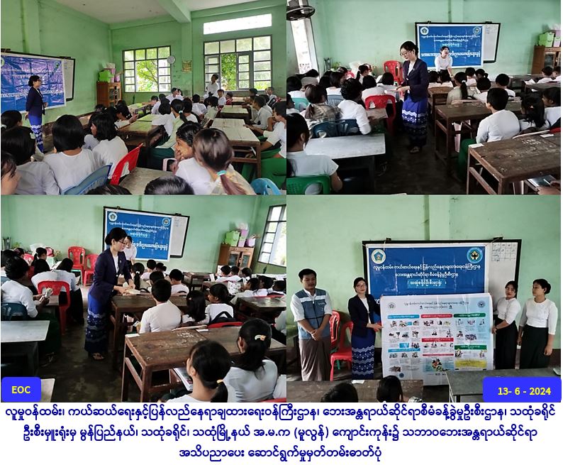လူမှုဝန်ထမ်း၊ ကယ်ဆယ်ရေးနှင့် ပြန်လည်နေရာချထားရေးဝန်ကြီးဌာန၊ ဘေးအန္တရာယ်ဆိုင်ရာစီမံခန့်ခွဲမှုဦးစီးဌာန၊ သထုံခရိုင်ဦးစီးမှူးရုံးမှ တာဝန်ရှိသူများသည် (၁၃-၆-၂၀၂၄) ရက်နေ့၊ (၀၉း၃၀) နာရီအချိန်မှ (၁၀း၃၀) နာရီအချိန်ထိ မွန်ပြည်နယ်၊ သထုံခရိုင်၊ သထုံမြို့နယ် အ.မ.က (မူလွန်) ကျောင်းကုန်းရှိ ကျောင်းသား/သူ အင်အား (၁၀၀) ဦးခန့်အား သဘာဝဘေးအန္တရာယ်ဆိုင်ရာ အသိပညာပေးနှင့်ပတ်သက်၍ သိရှိလိုက်နာဆောင်ရွက်ရမည့်ဆောင်ရန်/ရှောင်ရန်အချက်များအား ဟောပြောဆွေးနွေးခြင်း လက်ကမ်း စာစောင်ဖြန့်ဝေခြင်း၊ ဗီနိုင်းပိုစတာဖြန့်ဝေခြင်းနှင့် စာအုပ်များဖြန့်ဝေပေးခြင်းတို့အား ဆောင်ရွက်ခဲ့ပါကြောင်း သတင်းရရှိပါသည်။