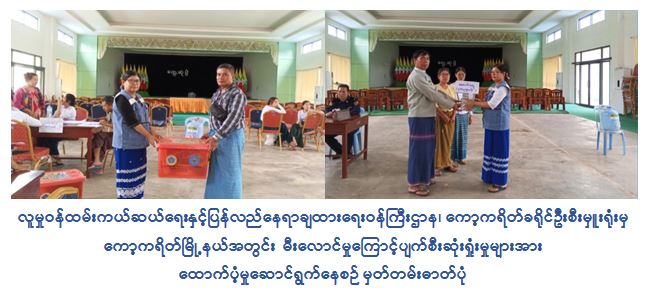 လူမှုဝန်ထမ်း၊ ကယ်ဆယ်ရေးနှင့် ပြန်လည်နေရာချထားရေးဝန်ကြီးဌာန၊ ဘေးအန္တရာယ်ဆိုင်ရာစီမံခန့်ခွဲမှုဦးစီးဌာန၊ ကရင်ပြည်နယ်၊ ကော့ကရိတ်ခရိုင်ဦးစီးမှူးရုံးမှ တာဝန်ရှိသူများသည် ကရင်ပြည်နယ်၊ ကော့ကရိတ်မြို့နယ်အတွင်း တိုက်ပွဲများဖြစ်ပွားမှုကြောင့် နေအိမ်မီးလောင် ပျက်စီးဆုံးရှုံးခဲ့သည့် နေအိမ်(၂၇)လုံးအတွက် အိမ်ဆောက်ပစ္စည်းဖိုးငွေ (၅,၄၀၀,၀၀၀)၊ အိမ်ထောင်စု(၂၇)စုမှ လူဦးရေ(၁၀၄)ဦးတို့အတွက် (၇)ရက်စာဆန်ရိက္ခာဖိုးငွေ (၂၁၈,၄၀၀)၊ စုစုပေါင်း(၅,၆၁၈,၄၀၀)နှင့် ကယ်ဆယ်ရေးပစ္စည်း(၁၇)မျိုး (၂၇)အိမ်ထောင်စုစာတို့အား (၈-၆-၂၀၂၄)ရက်နေ့နှင့် (၁၀-၆-၂၀၂၄)ရက်နေ့တို့တွင် ကော့ကရိတ်ခရိုင်ဦးစီးမှူးရုံးမှ တာဝန်ရှိသူ များနှင့် ကယ်ဆယ်ရေး/ထောက်ပံ့ရေးပစ္စည်းများ လက်ခံ၊ လွှဲပြောင်း၊ ထောက်ပံ့ရေးလုပ်ငန်း ကော်မတီများနှင့်အတူ ဘေးသင့်ပြည်သူများ၏ လက်ဝယ်အရောက်ထောက်ပံ့ခဲ့ကြောင်း သတင်းရရှိပါသည်။