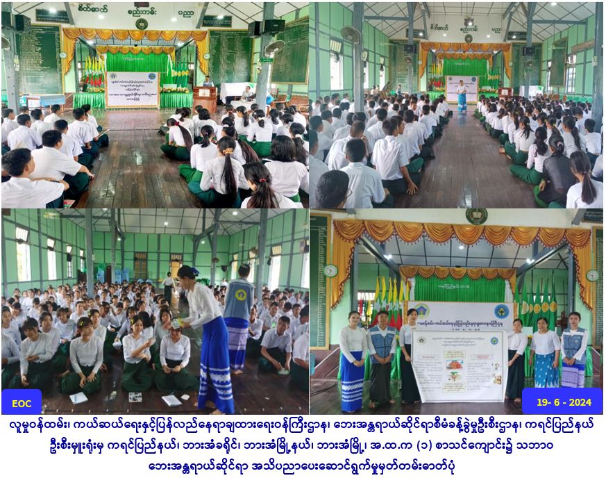 လူမှုဝန်ထမ်း၊ ကယ်ဆယ်ရေးနှင့် ပြန်လည်နေရာချထားရေးဝန်ကြီးဌာန၊ ဘေးအန္တရာယ်ဆိုင်ရာစီမံခန့်ခွဲမှုဦးစီးဌာန၊ ကရင်ပြည်နယ်ဦးစီးမှူးရုံးမှ တာဝန်ရှိသူများသည် လူမှုဝန်ထမ်းဦးစီးဌာနတို့နှင့်ပူးပေါင်း၍ (၁၉-၆-၂၀၂၄)ရက်နေ့၊ (၀၉:၃၀)အချိန်မှ (၁၂:၀၀) အချိန်ထိ ဘားအံမြို့၊ အ.ထ.က(၁) စာသင်ကျောင်း၌ ဆရာ/မ (၈)ဦးနှင့် ကျောင်းသား/သူ (၂၀၀)ဦး၊ စုစုပေါင်း (၂၀၈)ဦးတို့အား ကရင်ပြည်နယ်ဦးစီးမှူးရုံးမှ သဘာဝဘေးအန္တရာယ်နှင့်ပတ်သက်၍ ဆောင်ရန်/ရှောင်ရန်အချက်များ၊ သဘာဝပတ်ဝန်း ကျင်ဆိုင်ရာကိစ္စရပ်များ ဟောပြောဆွေးနွေးခြင်း၊ တောမီးအန္တရာယ်နှင့်ရာသီဥတုပြောင်းလဲမှုဆိုင်ရာကိစ္စရပ်များဟောပြော ဆွေးနွေးခြင်းနှင့် လူမှုဝန်ထမ်းဦးစီးဌာနမှ အမျိုးသမီးများနှင့် အရေးပေါ်အခြေအနေများဆိုင်ရာကိစ္စရပ်များ ဟောပြောဆွေးနွေး ခဲ့ပါသည်။ ထို့အပြင် ဘေး (၉)မျိုး အသိပညာပေးလက်ကမ်းစာစောင်များအား ကျောင်းသား/သူများထံ ဝေငှပေးခြင်း၊ ကျောင်းဝန်း အတွင်း၌ ဗီနိုင်းပိုစတာကပ်နှံနိုင်ရေးအတွက် လေပြင်းဘေးအသိပညာပေး ဗီနိုင်းပိုစတာ ပေးအပ်ခြင်းများဆောင်ရွက်ခဲ့ပါကြောင်း သတင်းရရှိပါသည်။