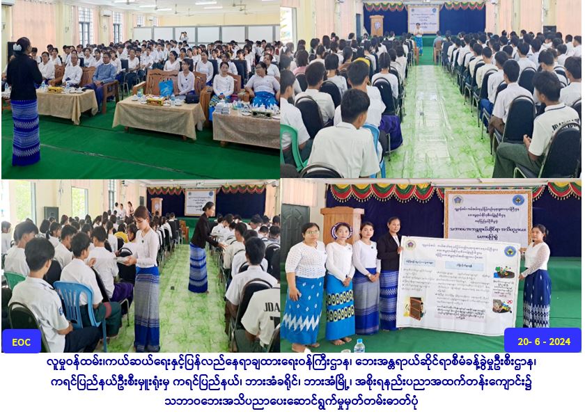 လူမှုဝန်ထမ်း၊ ကယ်ဆယ်ရေးနှင့် ပြန်လည်နေရာချထားရေးဝန်ကြီးဌာန၊ ဘေးအန္တရာယ်ဆိုင်ရာစီမံခန့်ခွဲမှုဦးစီးဌာန၊ ကရင်ပြည်နယ်ဦးစီးမှူးရုံးမှ တာဝန်ရှိသူများသည် လူမှုဝန်ထမ်းဦးစီးဌာန၊ ပြန်လည်ထူထောင်ရေးဦးစီးဌာနတို့နှင့်ပူးပေါင်း၍ (၂၀-၆-၂၀၂၄)ရက်နေ့၊ (၀၉:၃၀)အချိန်မှ (၁၂:၀၀) အချိန်ထိ ဘားအံမြို့၊ အစိုးရနည်းပညာအထက်တန်းကျောင်း၌ ဆရာ/မ (၁၁)ဦးနှင့် ကျောင်းသား/သူ (၁၂၈)ဦး၊ စုစုပေါင်း (၁၃၉) ဦးတို့အား ကရင်ပြည်နယ်ဦးစီးမှူးရုံးမှ သဘာဝဘေးအန္တရာယ်နှင့်ပတ်သက်၍ ဆောင်ရန်/ရှောင်ရန်အချက်များ၊ သဘာဝပတ်ဝန်းကျင်ဆိုင်ရာကိစ္စရပ်များ၊ တောမီးအန္တရာယ်နှင့် ရာသီဥတုပြောင်းလဲမှုဆိုင်ရာ ကိစ္စရပ်များနှင့်ပတ်သက်သည့် အသိပညာပေးဟောပြောမှုများအားလည်းကောင်း၊ လူမှုဝန်ထမ်းဦးစီးဌာနမှ အမျိုးသမီးများနှင့် အရေးပေါ်အခြေအနေများဆိုင်ရာ ကိစ္စရပ်များအားလည်းကောင်း၊ ပြန်လည်ထူထောင်ရေးဦးစီးဌာနမှ မသန်စွမ်းသူများ၏ အခွင့် အရေးများဆိုင်ရာကိစ္စရပ်များအားလည်းကောင်း ဟောပြောဆွေးနွေးခဲ့ပြီး ဘေး (၉) မျိုး အသိပညာပေးလက်ကမ်းစာစောင် ဝေငှပေးခြင်းအားလည်းကောင်း၊ မုန်တိုင်းဘေး (တိုင်းရင်း သားဘာသာစကား) လက်ကမ်းစာစောင်များ၊ ကျောင်းဝန်းအတွင်း၌ ဗီနိုင်းပိုစတာကပ်နိုင်ရေးအတွက် မြေပြိုဘေးအသိပညာပေး ဗီနိုင်းပိုစတာပေးအပ်ခြင်းများ ဆောင်ရွက်ခဲ့ပါကြောင်း သတင်းရရှိပါသည်။