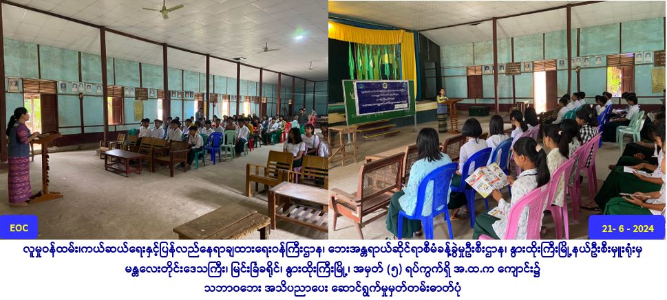 လူမှုဝန်ထမ်း၊ ကယ်ဆယ်ရေးနှင့်ပြန်လည်နေရာချထားရေးဝန်ကြီးဌာန၊ ဘေးအန္တရာယ်ဆိုင်ရာစီမံခန့်ခွဲမှုဦးစီးဌာန၊ နွားထိုးကြီး မြို့နယ်ဦးစီးမှူးရုံးမှ တာဝန်ရှိသူများသည် (၂၁-၆-၂၀၂၄) ရက်နေ့၊ (၁၀:၀၀) နာရီအချိန်မှ (၁၁:၀၀) နာရီအချိန်အထိ မန္တလေးတိုင်း ဒေသကြီး၊ မြင်းခြံခရိုင်၊ နွားထိုးကြီးမြို့၊ အမှတ် (၅) ရပ်ကွက်ရှိ အ.ထ.က ကျောင်း၌ ကျောင်းသား/သူ (၁၀၀) ဦးအား သဘာဝဘေးအန္တရာယ်ဆိုင်ရာ အသိ ပညာပေးဟောပြောဆွေးနွေးခြင်း၊ လက်ကမ်းစာစောင်များဖြန့်ဝေပေးခြင်းများ ဆောင်ရွက်ခဲ့ပါကြောင်း သတင်းရရှိပါသည်။