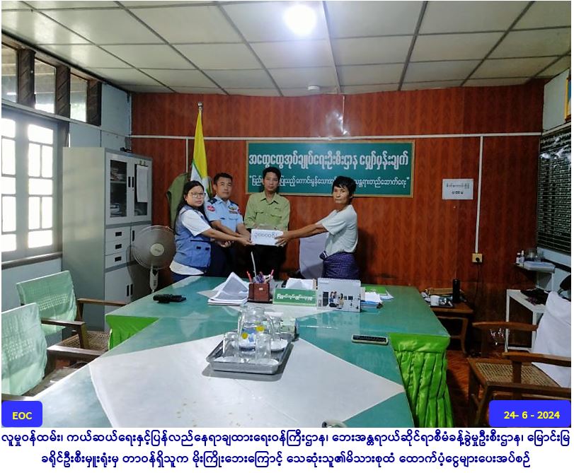 လူမှု၀န်ထမ်း၊ ကယ်ဆယ်ရေးနှင့်ပြန်လည်နေရာချထားရေး၀န်ကြီးဌာန၊ ဘေးအန္တရာယ်ဆိုင်ရာစီမံခန့်ခွဲမှုဦးစီးဌာန၊ မြောင်းမြခရိုင် ဦးစီးမှူးရုံးမှ တာ၀န်ရှိသူများသည် မြောင်းမြခရိုင်၊ အိမ်မဲမြို့နယ်၊ ဇရပ်ဆိပ်ကျေးရွာအုပ်စု၊ ရိုးကြီးကျေးရွာ၌ (၂၁ -၆-၂၀၂၄)ရက်နေ့၊ (၁၅: ၄၀)အချိန်တွင် ဖြစ်ပွားခဲ့သော မိုးကြိုးဘေးကြောင့် သေဆုံးသူ (၁) ဦးအတွက် ထောက်ပံ့ငွေ (၃၀၀၀၀၀ိ/-)ကျပ်အား (၂၄-၆-၂၀၂၄)ရက်နေ့၊ နေ့လည် (၁၃:၀၀) နာရီအချိန်တွင် အိမ်မဲမြို့နယ်၊ အထွေထွေအုပ်ချုပ်ရေးဦးစီးဌာနရုံးတွင် သေဆုံးသူ၏ မိသားစုထံသို့ သွားရောက်ထောက်ပံ့ပေးခဲ့ပါကြောင်း သတင်းရရှိပါသည်။