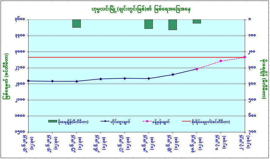 ယနေ့မြန်မာစံတော်ချိန် (၁၂:၃၀) နာရီအချိန် တိုင်းထွာချက်အရ ချင်းတွင်းမြစ်ရေသည် ဟုမ္မလင်းမြို့တွင် ယင်းမြို့၏စိုးရိမ်ရေမှတ်အောက် ၇ ပေခွဲခန့် (၂၂၃ စင်တီမီတာ) တွင် ရောက်ရှိနေပါသည်။ အဆိုပါမြစ်ရေသည် နောက် ၂ ရက်အတွင်း ယင်းမြို့၏စိုးရိမ်ရေမှတ်သို့ ရောက်ရှိနိုင်ပါသည်။