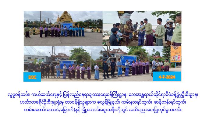 လူမှုဝန်ထမ်း၊ ကယ်ဆယ်ရေးနှင့်ပြန်လည်နေရာချထားရေးဝန်ကြီးဌာန၊ ဘေးအန္တရာယ်ဆိုင်ရာစီမံခန့်ခွဲမှုဦးစီးဌာန၊ ဟင်္သာတခရိုင်ဦးစီးမှုးရုံးမှ တာဝန်ရှိသူများသည် ဇလွန်မြို့နယ်အထွေထွေအုပ်ချုပ်ရေးဦးစီးဌာန၊ မီးသတ်ဦးစီးဌာန၊ မြို့နယ်အမျိုးသမီးရေးရာအဖွဲ့၊ မိခင်နှင့်ကလေးစောင့်ရှောက်ရေးအဖွဲ့တို့နှင့် ပူးပေါင်း၍ (၄-၇-၂၀၂၄)ရက်နေ့တွင် ဇလွန်မြိုနယ်၊ ကမ်းနားရပ်ကွက်၊ ဆန်တန်းရပ်ကွက်၊ လမ်းမတော်(တောင်/မြောက်)နှင့် မြို့ဟောင်းဈေးအနီး ပြည်သူများအား ရေဘေးနှင့် မြေပြိုဘေးအန္တရာယ် ကြိုတင်ကာကွယ်ရေးအတွက် ဆောင်ရန်/ ရှောင်ရန်အချက်များအား သိရှိနိုင်စေရန် သဘာဝဘေးအသိပညာပေးလှည့်လည်နှိုးဆော်ခြင်းနှင့် လက်ကမ်းစာစောင်များဖြန့်ဝေခြင်းတို့ကို ဆောင်ရွက်ခဲ့ပါကြောင်းသတင်းရရှိပါသည်။