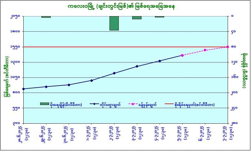 ယနေ့မြန်မာစံတော်ချိန် (၁၂:၃၀) နာရီအချိန် တိုင်းထွာချက်အရ ချင်းတွင်းမြစ်ရေသည် ကလေးဝမြို့တွင် ယင်းမြို့၏စိုးရိမ်ရေမှတ်အောက် ၄ ပေခွဲကျော်ခန့် (၁၃၉ စင်တီမီတာ) တွင် ရောက်ရှိနေပါသည်။ အဆိုပါမြစ်ရေသည် နောက် ၂ ရက်အတွင်း ယင်းမြို့၏စိုးရိမ်ရေမှတ်သို့ ရောက်ရှိနိုင်ပါသည်။