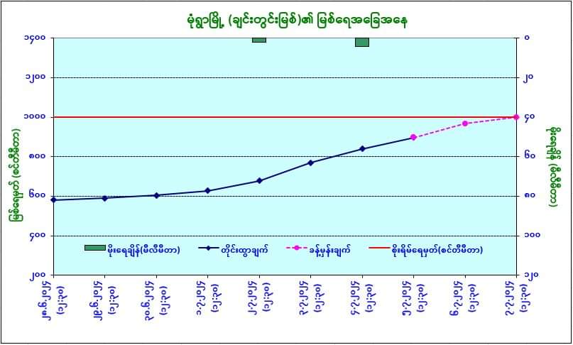 ယနေ့မြန်မာစံတော်ချိန် (၁၂:၃၀) နာရီအချိန် တိုင်းထွာချက်အရ ချင်းတွင်းမြစ်ရေသည် မုံရွာမြို့တွင် ယင်းမြို့၏စိုးရိမ်ရေမှတ်အောက် ၃ ပေခွဲခန့် (၁၀၂ စင်တီမီတာ) တွင် ရောက်ရှိနေပါသည်။ အဆိုပါမြစ်ရေသည် နောက် ၂ ရက်အတွင်း ယင်းမြို့၏စိုးရိမ်ရေမှတ်သို့ ရောက်ရှိနိုင်ပါသည်။