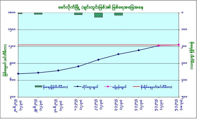 ယနေ့မြန်မာစံတော်ချိန် (၁၂:၃၀) နာရီအချိန် တိုင်းထွာချက်အရ ချင်းတွင်းမြစ်ရေသည် မော်လိုက်မြို့တွင် ယင်းမြို့၏စိုးရိမ်ရေမှတ်အောက် ပေဝက်ခန့် (၁၄ စင်တီမီတာ) တွင် ရောက်ရှိနေပါသည်။ အဆိုပါမြစ်ရေသည် နောက် ၆ နာရီအတွင်း ယင်းမြို့၏စိုးရိမ်ရေမှတ်သို့ ရောက်ရှိနိုင်ပါသည်။