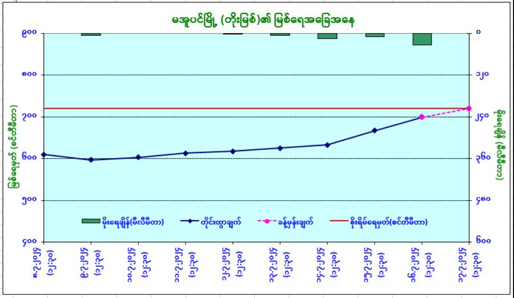 ယနေ့မြန်မာစံတော်ချိန် (၁၂:၃၀) နာရီအချိန် တိုင်းထွာချက်အရ တိုးမြစ်ရေသည် မအူပင်မြို့တွင် ယင်းမြို့၏စိုးရိမ်ရေမှတ်အောက် ပေဝက်ကျော်ခန့် (၂၁ စင်တီမီတာ) တွင် ရောက်ရှိနေပါသည်။ အဆိုပါမြစ်ရေသည် နောက် ၁ ရက်အတွင်း ယင်းမြို့၏စိုးရိမ်ရေမှတ်သို့ ရောက်ရှိနိုင်ပါသည်။