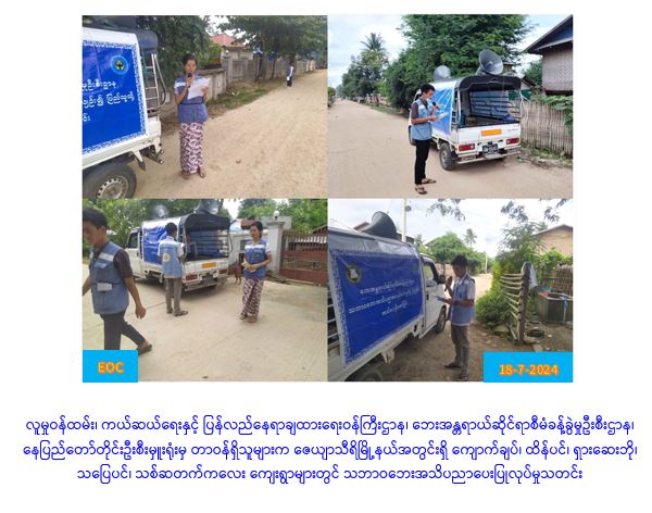 လူမှုဝန်ထမ်း၊ ကယ်ဆယ်ရေးနှင့် ပြန်လည်နေရာချထားရေးဝန်ကြီးဌာန၊ ဘေးအန္တရာယ်ဆိုင်ရာစီမံခန့်ခွဲမှု ဦးစီးဌာန၊ ပြည်ထောင်စုနယ်မြေ၊ နေပြည်တော်တိုင်းဦးစီးမှူးရုံးမှ တာဝန်ရှိသူများသည် (၁၇-၇-၂၀၂၄) ရက်နေ့၊ နံနက်(၀၉း၀၀) နာရီအချိန်မှစ၍ ဇေယျာသီရိမြို့နယ်အတွင်းရှိ ကျောက်ချပ်၊ ထိန်ပင်၊ ရှားဆေးဘို၊ သပြေပင်၊ သစ်ဆတက်ကလေး ကျေးရွာများတွင် သဘာဝေဘးအန္တရာယ်များအနက် ယခုကာလတွင်ဖြစ်ပေါ်တတ်သည့် ရေဘေးအန္တရာယ်နှင့် မြေပြို/ ကမ်းပြိုဘေးအန္တရာယ်များ ကြိုတင်ပြင်ဆင်ရေးနှင့်စပ်လျဉ်း၍ ဆောင်ရန်/ ရှောင်ရန်အချက်များအား ပြည်သူများသို့ အသိပညာပေး လှည့်လည်နှိုးဆော်ခြင်း၊ လက်ကမ်းစာစောင်များ ဖြန့်ဝေခြင်းတို့ကို ဆောင်ရွက်ခဲ့ကြောင်း သတင်းရရှိပါသည်။