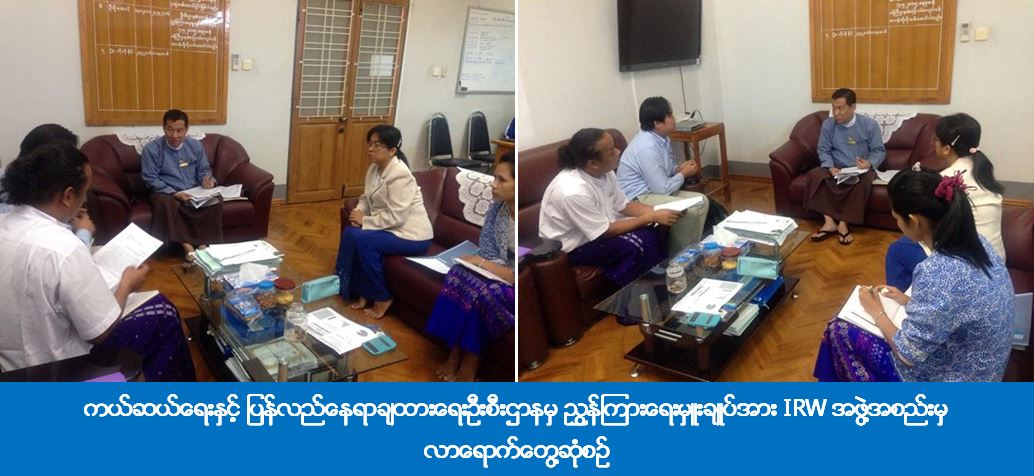 (၂၂-၁၁-၂၀၁၆) ရက်နေ့တွင် ကယ်ဆယ်ရေးနှင့် ပြန်လည်နေရာချထားရေးဦးစီးဌာနမှ ညွှန်ကြားရေးမှူးချုပ်အား IRW အဖွဲ့အစည်းမှ ကိုယ်စားလှယ်များသည် ဧရာဝတီတိုင်းဒေသကြီးနှင့် ရခိုင်ပြည်နယ်အတွင်း ကမ်းရိုးတန်းဒေသများ၌ ဘက်စုံသုံးဆိုင်ကလုန်းမုန်တိုင်းဒဏ်ခံအဆောက်အအုံ (Multi-Purpose Cyclone Roof Shelter) (၂၇) လုံး ဆောက်လုပ်လှူဒါန်းလိုသည့်ကိစ္စနှင့်စပ်လျဉ်း၍ လာရောက်တွေ့ဆုံရာ ညွှန်ကြားရေးမှူးချုပ်နှင့် တာဝန်ရှိသူများက လက်ခံခဲ့ကြကြောင်း သိရှိရပါသည်။