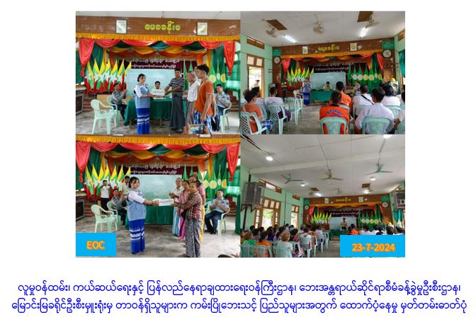 လူမှုဝန်ထမ်း၊ ကယ်ဆယ်ရေးနှင့် ပြန်လည်နေရာချထားရေးဝန်ကြီးဌာန၊ ဘေးအန္တရာယ်ဆိုင်ရာစီမံခန့်ခွဲမှုဦးစီးဌာန၊ မြောင်းမြခရိုင်ဦးစီးမှူးရုံးမှ တာဝန်ရှိသူများသည် မြောင်းမြခရိုင်၊ ဝါးခယ်မမြို့နယ်၊ အထက်ပေကုန်းကျေးရွာအုပ်စု၊ အထက်ပေကုန်းကျေးရွာနှင့် တြိန်းကျွန်းကျေးရွာအုပ်စု၊ အောင်လှိုင်ကျေးရွာတို့၌ (၂၀-၇-၂၀၂၄) ရက်နေ့နှင့် (၂၁-၇-၂၀၂၄)ရက်နေ့တို့တွင် ဖြစ်ပွားခဲ့သော ကမ်းပြိုဘေးကြောင့် ပြောင်းရွှေ့ လူနေအိမ်(၃၅)လုံးအတွက် အိမ်ဆောက်ပစ္စည်းဖိုးထောက်ပံ့ငွေ (၃,၅၀၀,၀၀၀ိ/-)နှင့် ဘေးသင့်ပြည်သူ (၁၄၃) ဦးတို့အတွက် ဆန်ရိက္ခာဖိုးထောက်ပံ့ငွေ (၃၀၀,၃၀၀ိ/-)၊ စုစုပေါင်း ထောက်ပံ့ငွေ (၃,၈၀၀,၃၀၀ိ/-) တို့အား (၂၂-၇-၂၀၂၄)ရက်နေ့၊ နေ့လယ်(၁၃း၀၀) နာရီအချိန်တွင် မြောင်းမြခရိုင်စီမံအုပ်ချုပ်ရေးအဖွဲ့၊ မြို့နယ်စီမံအုပ်ချုပ်ရေးအဖွဲ့နှင့် ဌာနဆိုင်ရာအသီးသီးမှ တာဝန်ရှိသူများ၊ လူမှုရေးပရဟိတအဖွဲ့အစည်းများနှင့်အတူ ဝါးခယ်မမြို့နယ်၊ ရွှေလောင်းမြို့၊ အထက(၁) မေခခန်းမတွင်ဘေးသင့်ပြည်သူများထံသို့ လက်ဝယ်အရောက် သွားရောက်ထောက်ပံ့ခဲ့ကြောင်း သတင်းရရှိပါသည်။