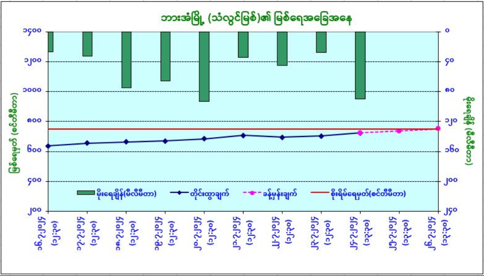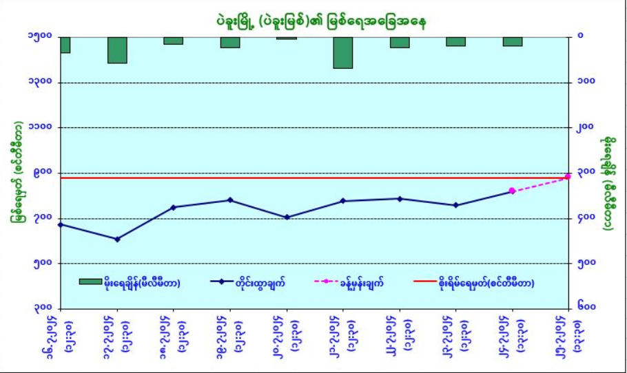 ယနေ့မြန်မာစံတော်ချိန် (၁၃:၃၀) နာရီအချိန် တိုင်းထွာချက်အရ ပဲခူးမြစ်ရေသည် ပဲခူးမြို့တွင် ယင်းမြို့၏စိုးရိမ်ရေမှတ် ၂၈.၈၇ ပေ (၈၈၀ စင်တီမီတာ)အောက် ၂ ပေခန့် (၅၈ စင်တီမီတာ)တွင် ရောက်ရှိနေပါသည်။ အဆိုပါမြစ်ရေသည် နောက် ၁ ရက်အတွင်း ယင်းမြို့၏စိုးရိမ်ရေမှတ်သို့ ရောက်ရှိနိုင်ပါသည်။