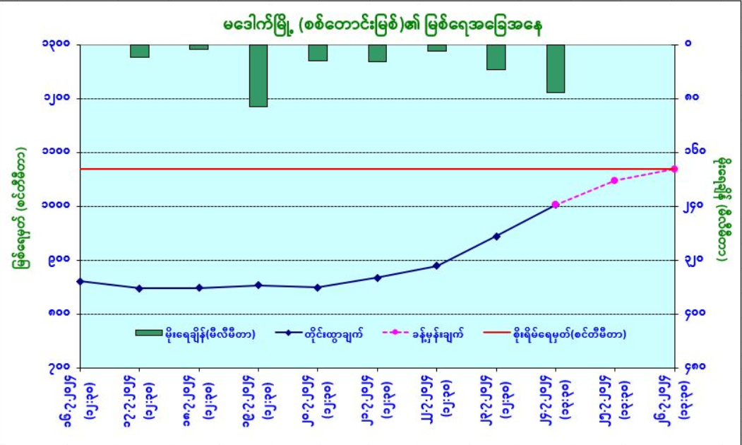 ယနေ့မြန်မာစံတော်ချိန် (၁၃:၃၀) နာရီအချိန် တိုင်းထွာချက်အရ စစ်တောင်းမြစ်ရေသည် မဒေါက်မြို့တွင် ယင်းမြို့၏စိုးရိမ်ရေမှတ် ၃၅.၁၀ ပေ (၁၀၇၀ စင်တီမီတာ)အောက် ၂ ပေကျော်ခန့် (၆၇ စင်တီမီတာ)တွင် ရောက်ရှိနေပါသည်။ အဆိုပါမြစ်ရေသည် နောက် ၂ ရက်အတွင်း ယင်းမြို့ ၏စိုးရိမ်ရေမှတ်သို့ ရောက်ရှိနိုင်ပါသည်။