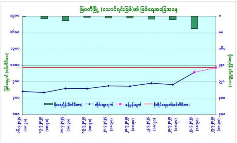 ယနေ့မြန်မာစံတော်ချိန် (၁၈:၃၀) နာရီအချိန် တိုင်းထွာချက်အရ သောင်ရင်းမြစ်ရေသည် မြဝတီမြို့တွင် ယင်းမြို့၏စိုးရိမ်ရေမှတ် ၃၁.၅၉ ပေ (၉၆၃ စင်တီမီတာ) အောက် ၃ ပေခန့် (၈၆ စင်တီမီတာ) တွင် ရောက်ရှိနေပါသည်။ အဆိုပါမြစ်ရေသည် နောက် ၁ ရက်အတွင်း ယင်းမြို့၏ စိုးရိမ်ရေမှတ်သို့ ရောက်ရှိနိုင်ပါသည်။