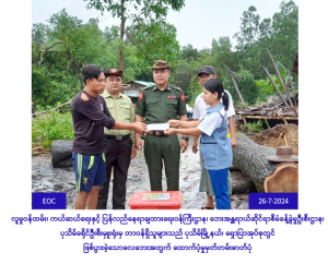 လူမှု၀န်ထမ်း၊ ကယ်ဆယ်ရေးနှင့် ပြန်လည်နေရာချထားရေး၀န်ကြီးဌာန၊ ဘေးအန္တရာယ်ဆိုင်ရာစီမံခန့်ခွဲမှုဦးစီးဌာန ပုသိမ်ခရိုင်ဦးစီးမှူးရုံးမှ တာ၀န်ရှိသူများသည် (၂၅-၇-၂၀၂၄) ရက်နေ့ (၀၅း၀၀) နာရီအချိန်၌ ပုသိမ်ခရိုင်၊ ပုသိမ်မြို့နယ်၊ ရှောပြာအုပ်စု၊ ကလပ်ချီအထက် (၀က်လာကွင်း) ကျေးရွာတွင် မိုးသည်းထန်စွာ ရွာသွန်းပြီး လေပြင်းတိုက်ခတ်မှုကြောင့် (ဓန်မိုး၊ ထရံကာ၊ ပျဥ်ခင်း) ပြိုကျပျက်စီးအိမ်ခြေ (၂) လုံးအတွက် အိမ်ဆောက်ပစ္စည်းဖိုးထောက်ပံ့ငွေ(၂၀၀,၀၀ဝိ/-)၊ ဘေးသင့်လူဦးရေစုစုပေါင်း (၆) ဦးအတွက် (၇) ရက်စာ ဆန်ရိက္ခာဖိုးထောက်ပံ့ငွေ (၁၂,၆၀ဝိ/-)၊ စုစုပေါင်းထောက်ပံ့ငွေ (၂၁၂,၆၀ဝိ/-) နှင့် ကယ်ဆယ်ရေးပစ္စည်း (၁၇)မျိုး စက္ကူပုံး (၂) ပုံး၊ (၂၁၅,၃၅၆/-) တို့အား (၂၆-၇-၂၀၂၄)ရက်နေ့ (၁၃း၄၅) နာရီအချိန်တွင် ပုသိမ် မြို့နယ်စီမံအုပ်ချုပ်ရေးအဖွဲ့မှ တာ၀န်ရှိသူများနှင့်အတူ ဘေးသင့်ပြည်သူများလက်၀ယ်သို့ ကွင်းဆင်းထောက်ပံ့ ပေးအပ်ခဲ့ကြောင်း သတင်းရရှိပါသည်။