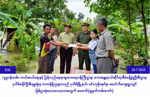လူမှု၀န်ထမ်း၊ ကယ်ဆယ်ရေးနှင့် ပြန်လည်နေရာချထားရေး၀န်ကြီးဌာန၊ ဘေးအန္တရာယ်ဆိုင်ရာစီမံခန့်ခွဲမှုဦးစီးဌာန ပုသိမ်ခရိုင်ဦးစီးမှူးရုံးမှ တာ၀န်ရှိသူများသည် (၂၅-၇-၂၀၂၄)ရက်နေ့ (၀၁း၀၀) နာရီအချိန်၌ ပုသိမ် ခရိုင်၊ ပုသိမ်မြို့နယ်၊ မင်းကုန်းအုပ်စု၊ မောင်ဘိကျေးရွာတွင် မိုးသည်းထန်စွာရွာသွန်းပြီး လေပြင်းတိုက်ခတ် မှုကြောင့် (ဓန်မိုး၊ ဓနိကာ၊ ပျဥ်ခင်း) ပြိုကျပျက်စီးနေအိမ် (၁)လုံးအတွက် အိမ်ဆောက်ပစ္စည်းဖိုးထောက်ပံ့ငွေ (၁၀၀,၀၀ဝိ/-)၊ ဘေးသင့်လူဦးရေ (၄) ဦးအတွက် (၇)ရက်စာ ဆန်ရိက္ခာဖိုးထောက်ပံ့ငွေ (၈,၄၀ဝိ/-)၊ စုစုပေါင်းထောက်ပံ့ငွေ (၁၀၈,၄၀ဝိ/-) နှင့် ကယ်ဆယ်ရေးပစ္စည်း (၁၇) မျိုး စက္ကူပုံးပါ(၁)ပုံး၊ (၁၀၇,၆၇၈/-) တို့အား (၂၆-၇-၂၀၂၄)ရက်နေ့ (၁၄း၁၅) နာရီအချိန်တွင် သက်ဆိုင်ရာမြို့နယ်စီမံအုပ်ချုပ်ရေးအဖွဲ့မှ တာ၀န်ရှိသူများနှင့်အတူ ဘေးသင့်ပြည်သူများလက်၀ယ်သို့အရောက် ကွင်းဆင်းထောက်ပံ့ပေးအပ်ခဲ့ပါကြောင်း သတင်းရရှိပါသည်။