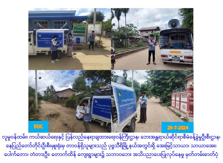 လူမှုဝန်ထမ်း၊ ကယ်ဆယ်ရေးနှင့် ပြန်လည်နေရာချထားရေးဝန်ကြီးဌာန၊ ဘေးအန္တရာယ်ဆိုင်ရာစီမံခန့်ခွဲမှုဦးစီးဌာန၊ ပြည်ထောင်စုနယ်မြေ၊ နေပြည်တော်တိုင်းဦးစီးမှူးရုံးမှ တာဝန်ရှိသူများသည် (၂၉.၇.၂၀၂၄ ) ရက်နေ့၊ နံနက်(၀၉:၀၀) နာရီအချိန်မှစ၍ ပုဗ္ဗသီရိမြို့နယ်အတွင်းရှိ အေးမြင့်သာယာ၊ သာယာအေး၊ ပေါက်တော၊ တံတားဦး၊ တောက်ထိန်ကျေးရွာများတွင် သဘာဝေဘးအန္တရာယ်များအနက် ယခုကာလတွင် ဖြစ်ပေါ်တတ်သည့် ရေဘေးအန္တရာယ်နှင့် မြေပြို/ ကမ်းပြိုဘေးအန္တရာယ်များ ကြိုတင်ပြင်ဆင်ရေးနှင့် စပ်လျဉ်း၍ ဆောင်ရန်/ ရှောင်ရန်အချက်များကို ပြည်သူများ သိရှိစေရန်အတွက် အသိပညာပေးလိုက်လံနှိုးဆော်မှုများ ဆောင်ရွက်ခဲ့ပြီး အသိပညာပေးလက်ကမ်းစာစောင်များ ဖြန့်ဝေပေးခြင်းတို့ကို ဆောင်ရွက်ခဲ့ကြောင်း သတင်းရရှိပါသည်။