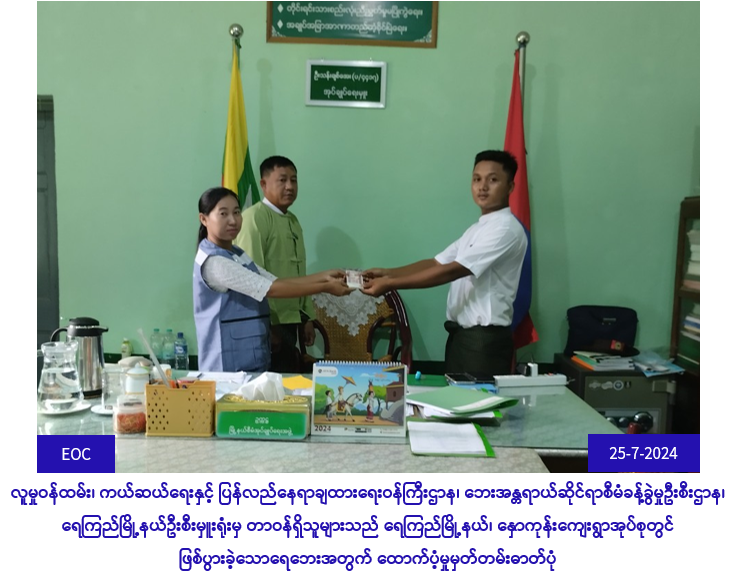 လူမှုဝန်ထမ်း၊ ကယ်ဆယ်ရေးနှင့် ပြန်လည်နေရာချထားရေးဝန်ကြီးဌာန၊ ဘေးအန္တရာယ်ဆိုင်ရာစီမံခန့်ခွဲမှုဦးစီးဌာန၊ ရေကြည်မြို့နယ်ဦးစီးမှူးရုံးမှတာဝန်ရှိသူများသည် (၂၄-၇-၂၀၂၄) ရက်နေ့တွင် ကျုံပျော်ခရိုင်၊ ရေကြည်မြို့နယ်၊ နှောကုန်းကျေးရွာအုပ်စု၊ နှောကုန်းကျေးရွာတွင် ငဝန်မြစ်ရေတက်မှုကြောင့် နှောကုန်း ဘုန်းတော်ကြီးကျောင်းသို့ ယာယီပြောင်းရွှေ့နေထိုင်သည့်အိမ်ထောင်စု (၁၅) စုရှိ လူဦးရေ (၆၀) ဦးတို့ အတွက် ဆန်ရိက္ခာဖိုးထောက်ပံ့ငွေ (၁၂၆,၀၀၀ိ/-) အား (၂၅-၇-၂၀၂၄) ရက်နေ့ (၁၂:၃၀) နာရီအချိန်တွင် တာဝန်ရှိသူများနှင့်အတူ ဘေးသင့်သူများလက်ဝယ်အရောက် ထောက်ပံ့ပေးအပ်ခဲ့ကြောင်း သတင်းရရှိပါ သည်။