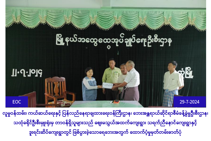 လူမှုဝန်ထမ်း၊ ကယ်ဆယ်ရေးနှင့် ပြန်လည်နေရာချထားရေးဝန်ကြီးဌာန၊ ဘေးအန္တရာယ်ဆိုင်ရာစီမံခန့်ခွဲမှုဦးစီးဌာန သထုံခရိုင်ဦးစီးမှူးရုံးမှ တာဝန်ရှိသူများသည် (၂၆-၇-၂၀၂၄) ရက်နေ့မှ (၂၈-၇-၂၀၂၄) ရက်နေ့အထိ သထုံမြို့နယ်၊ စျေးမသွယ်အထက်ကျေးရွာ၊ သရက်ညီနောင်ကျေးရွာနှင့် ဒူးရင်းဆိပ်ကျေးရွာတို့တွင် မိုးသည်းထန်စွာရွာသွန်း၍ ဒုံသမိမြစ်ရေမြင့်တက်လာမှုကြောင့် ရန်ကင်းအောင်ဓမ္မာရုံ၊ ရွာဦးဘုန်းကြီးကျောင်း၊ ရွာလယ်ဓမ္မာရုံနှင့် တပ်ဦးဘုန်းကြီးကျောင်းကယ်ဆယ်ရေးစခန်းတို့ရှိ အိမ်ထောင်စု (၁၅၀) စုတို့မှ စုစုပေါင်း လူဦးရေ (၆၀၉) ဦးတို့အတွက် (၇)ရက်စာ ဆန်ရိက္ခာဖိုးထောက်ပံ့ငွေ (၁,၂၇၈,၉၀ဝိ/-) ကျပ်အား (၂၉-၇-၂၀၂၄) ရက်နေ့ (၁၃:၃၀) နာရီအချိန်တွင် သထုံမြို့နယ်စီမံအုပ်ချုပ်ရေးအဖွဲ့ရုံး၌ သွားရောက်ထောက်ပံ့ပေးအပ်ခဲ့ကြောင်း သတင်းရရှိပါသည်။