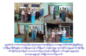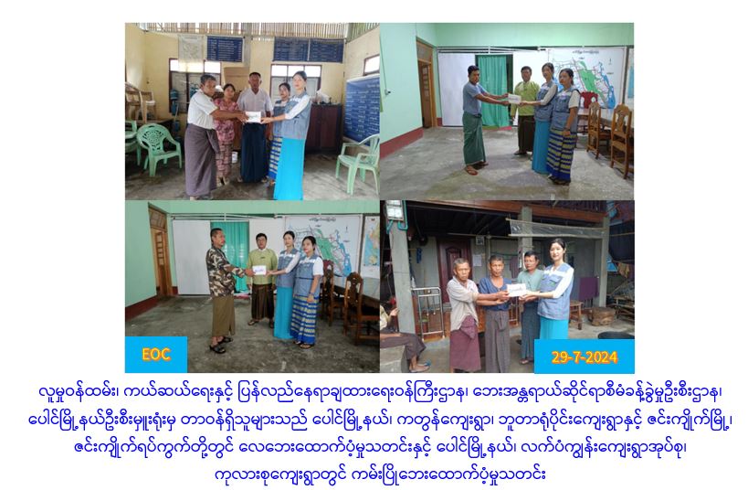 လူမှုဝန်ထမ်းကယ်ဆယ်ရေးနှင့် ပြန်လည်နေရာချထားရေးဝန်ကြီးဌာန၊ ဘေးအန္တရာယ်ဆိုင်ရာစီမံခန့်ခွဲမှုဦးစီးဌာန၊ ပေါင်မြို့နယ်ဦးစီးမှူးရုံးမှ တာဝန်ရှိသူများသည် (၂၆-၇-၂၀၂၄) ရက်နေ့၊ (၀၈း၃၀) နာရီအချိန်တွင် ပေါင်မြို့နယ်၊ ကတွန်ကျေးရွာနှင့် ဇင်းကျိုက်မြို့၊ ဇင်းကျိုက်ရပ်ကွက်တို့တွင် လေပြင်းတိုက်ခတ်မှုကြောင့် အမိုးလန်ပျက်စီးခဲ့သည့် အိမ်ထောင်စု(၄)စု၊ နေအိမ်(၄)လုံးအတွက် အိမ်ဆောက်ပစ္စည်းဖိုးထောက်ပံ့ငွေ (၂၀၀,၀၀၀ိ/-)၊ လူဦးရေ (၁၉)ဦးအတွက် (၇)ရက်စာ ဆန်ရိက္ခာဖိုးထောက်ပံ့ငွေ (၃၉,၉၀၀ိ/-)၊ (၂၆-၇-၂၀၂၄)ရက်နေ့ (၁၄း၀၀)နာရီအချိန်တွင် ပေါင်မြို့နယ်၊ ကျွဲခြံကျေးရွာအုပ်စု၊ ဘူတာရုံပိုင်းကျေးရွာတွင် လေပြင်းတိုက်ခတ်မှုကြောင့် အမိုးလန်ပျက်စီးခဲ့သည့် အိမ်ထောင်စု(၁)စု၊ နေအိမ် (၁)လုံးအတွက် အိမ်ဆောက်ပစ္စည်းဖိုးထောက်ပံ့ငွေ (၅၀,၀၀၀ိ/-)၊ လူဦးရေ (၂)ဦးအတွက် (၇)ရက်စာ ဆန်ရိက္ခာဖိုးထောက်ပံ့ငွေ (၄,၂၀ဝိ/-)၊ (၂၆-၇-၂၀၂၄)ရက်နေ့၊ (၁၅း၀၀) နာရီအချိန်တွင် ပေါင်မြို့နယ်၊ လက်ပံကျွန်းကျေးရွာအုပ်စု၊ ကုလားစုကျေးရွာတွင် သံလွင်မြစ်ရေတိုက်စားပြီး ကမ်းပါးပြိုကျမှုကြောင့် ကြိုတင်ဖျက်သိမ်းပြောင်းရွှေ့ခဲ့ရသည့် လူနေအိမ်(၉)လုံးအတွက် အိမ်ဆောက်ပစ္စည်းဖိုးထောက်ပံ့ငွေ (၉၀၀,၀၀၀ိ/-) နှင့် လူဦးရေ(၃၀)ဦးအတွက် (၇)ရက်စာဆန်ရိက္ခာဖိုးထောက်ပံ့ငွေ (၆၃,၀၀၀ိ/-) စုစုပေါင်းထောက်ပံ့ငွေ (၁,၂၅၇,၁၀၀ိ/-)တို့အား (၂၉-၇-၂၀၂၄)ရက်နေ့၊ (၁၃း၀၀) နာရီအချိန်တွင် ဘေးသင့်ပြည်သူများထံသို့ လက်ဝယ်အရောက် ထောက်ပံ့ပေးအပ်ခဲ့ကြောင်း သတင်းရရှိပါသည်။