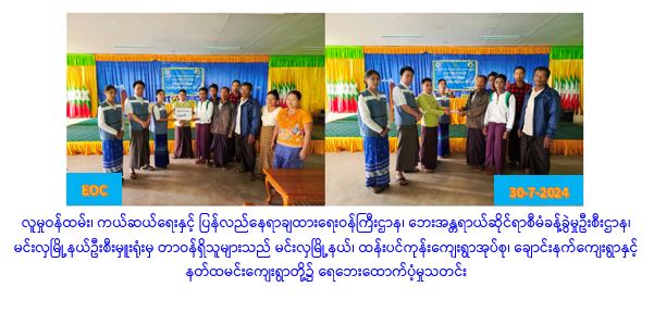 လူမှုဝန်ထမ်း၊ ကယ်ဆယ်ရေးနှင့် ပြန်လည်နေရာချထားရေးဝန်ကြီးဌာန၊ ဘေးအန္တရာယ်ဆိုင်ရာစီမံခန့်ခွဲမှုဦးစီးဌာန၊ မင်းလှမြို့နယ်ဦးစီးမှူးရုံးမှ တာဝန်ရှိသူများသည် ဧရာဝတီမြစ်ရေတက်၍ မြစ်လက်တက်ဖြစ်သော မြစ်မခမြစ်အတွင်းသို့ ဝင်ရောက်ရေလျှံမှုနှင့် မိုးရွာသွန်းမှုတို့ကြောင့် ဖြစ်ပွားခဲ့သောရေဘေးတွင် (၂၆-၇-၂၀၂၄) ရက်နေ့၌ မင်းလှမြို့နယ်၊ ထန်းပင်ကုန်းကျေးရွာအုပ်စု၊ ချောင်းနက်ကျေးရွာနှင့် နတ်ထမင်းကျေးရွာတို့မှ အ.ထ.က(ခွဲ)ထန်းပင်ကုန်းကျောင်း ရေဘေးကယ်ဆယ်ရေးစခန်းသို့ ထပ်မံပြောင်းရွှေ့လာသော အိမ်ထောင်စု(၄၆)စု၊ လူဦးရေ (၁၇၈)ဦးတို့အတွက် (၇)ရက်စာ ဆန်ရိက္ခာဖိုးထောက်ပံ့ငွေ (၃၇၃,၈၀၀ိ/-)နှင့် (၂၇-၇-၂၀၂၄) ရက်နေ့တွင် ဒီလှိုင်းဘုန်းတော်ကြီးကျောင်း ယာယီကယ်ဆယ်ရေးစခန်း နှင့် သဲကောဘုန်းတော်ကြီး ယာယီကယ်ဆယ်ရေးစခန်းသို့ ပြောင်းရွှေ့ရောက်ရှိလာသော အိမ်ထောင်စု (၉၈)စု၊ လူဦးရေ(၄၀၂)ဦးတို့အတွက် (၇)ရက်စာ ဆန်ရိက္ခာဖိုးထောက်ပံ့ငွေ (၈၄၄,၂၀ဝိ/-) တို့အား (၃၀-၇-၂၀၂၄) ရက်နေ့၊ (၁၀း၀၀) နာရီအချိန်တွင် ထွေ/အုပ်အစည်းအဝေးခန်းမ၌ မြို့နယ်မှတာဝန်ရှိသူများနှင့်အတူ ဘေးသင့်ပြည်သူများ၏ လက်ဝယ်အရောက် ထောက်ပံ့ပေးအပ်ခဲ့ကြောင်း သတင်းရရှိပါသည်။