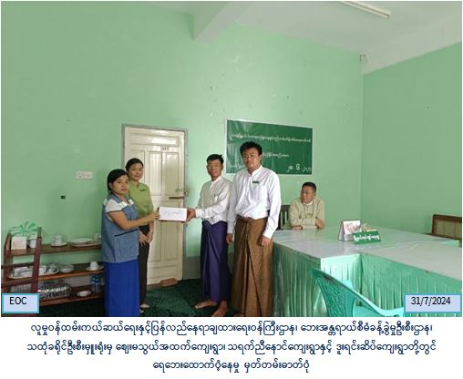 လူမှုဝန်ထမ်း ကယ်ဆယ်ရေးနှင့် ပြန်လည်နေရာချထားရေးဝန်ကြီးဌာန၊ ဘေးအန္တရာယ်ဆိုင်ရာစီမံခန့်ခွဲမှု ဦးစီးဌာန၊ သထုံခရိုင်ဦးစီးမှူးရုံးမှ တာဝန်ရှိသူများသည်(၂၈.၇.၂၀၂၄)ရက်နေ့မှ (၃၁.၇.၂၀၂၄)ရက်နေ့ အထိ သထုံမြို့နယ် စျေးမသွယ်အထက်ကျေးရွာ၊ သရက်ညီနောင်ကျေးရွာနှင့် ဒူးရင်းဆိပ်ကျေးရွာတို့တွင် မိုးများစွာရွာသွန်း၍ ဒုံသမိမြစ်ရေမြင့်တက်လာမှုကြောင့် ရန်ကင်းအောင်ဓမ္မာရုံ၊ ရွာဦးဘုန်းကြီးကျောင်း၊ ရွာလယ်ဓမ္မာရုံနှင့် တပ်ဦးဘုန်းကြီးကျောင်းကယ်ဆယ်ရေးစခန်းတို့ရှိ ထပ်တိုးအိမ်ထောင်စု (၄၂)စုတို့မှ (၁၈)နှစ်အထက် ကျား (၆၈)ဦး၊ မ (၆၆)ဦးနှင့် (၁၈)နှစ်အောက် ကျား (၁၇)ဦး၊ မ (၂၇)ဦး စုစုပေါင်း လူဦးရေ (၁၇၈)ဦးတို့အတွက် (၇)ရက်စာ ဆန်ရိက္ခာဖိုးငွေ (၃၇၃,၈၀ဝိ/-)ကျပ်အား (၃၁.၇.၂၀၂၄)ရက်နေ့ (၁၃:၀၀)နာရီအချိန်တွင် သထုံမြို့နယ်စီမံအုပ်ချုပ်ရေးအဖွဲ့ရုံး၌ သွားရောက်ထောက်ပံ့ပေးအပ်ခဲ့ကြောင်း သတင်းရရှိပါသည်။