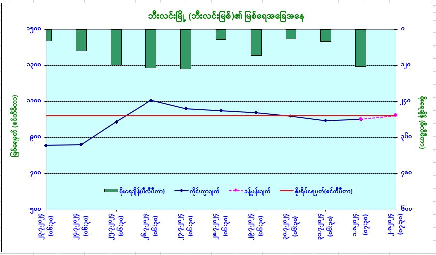 ယနေ့မြန်မာစံတော်ချိန် (၀၇:၃၀) နာရီအချိန် တိုင်းထွာချက်အရ ဘီးလင်းမြစ်ရေသည် ဘီးလင်းမြို့တွင် ယင်းမြို့၏စိုးရိမ်ရေမှတ် ၃၃.၅၃ ပေ (၁၀၂၂ စင်တီမီတာ)အောက် ပေဝက်ကျော်ခန့် (၂၀ စင်တီမီတာ)တွင် ရောက်ရှိနေပါသည်။ အဆိုပါမြစ်ရေသည် နောက် ၁ ရက်အတွင်း ယင်းမြို့၏စိုးရိမ်ရေမှတ်သို့ ရောက်ရှိနိုင်ပါသည်။