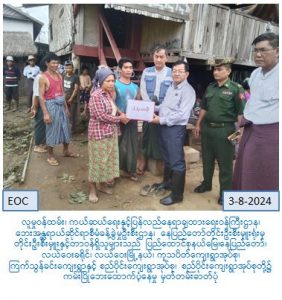 လူမှုဝန်ထမ်း၊ ကယ်ဆယ်ရေးနှင့်ပြန်လည်နေရာချထားရေးဝန်ကြီးဌာန၊ ဘေးအန္တရာယ်ဆိုင်ရာစီမံခန့်ခွဲမှုဦးစီးဌာန၊ နေပြည်တော်တိုင်းဦးစီးမှူးရုံးမှ တိုင်းဦးစီးမှူးနှင့်တာဝန်ရှိသူများသည် ပြည်ထောင်စုနယ်မြေ၊နေပြည်တော်၊ လယ်ဝေးခရိုင်၊ လယ်ဝေးမြို့နယ်၊ ကူသပိတ်ကျေးရွာအုပ်စု၊ ကြက်သွန်ခင်းကျေးရွာနှင့် စည်ပိုင်းကျေးရွာအုပ်စု၊ စည်ပိုင်းကျေးရွာအုပ်စုတို့၌ (၃.၈.၂၀၂၄)ရက်နေ့၊ (၀၈:၀၀)နာရီအချိန်တွင် ဖြစ်ပွားခဲ့သော ကမ်းပြိုဘေးကြောင့် ဖျက်သိမ်းပြောင်းရွှေ့ခဲ့ရသည့် နေအိမ်(၃)လုံးအတွက် အိမ်ဆောက်ပစ္စည်းဖိုးငွေ (၃၀၀,၀၀ဝ/-)၊ ဘေးသင့်လူဦးရေ (၁၃)ဦးအတွက် ဆန်ရိက္ခာဖိုးထောက်ပံ့ငွေ(၂၇၃,၀ဝ/-)၊ စုစုပေါင်းထောက်ပံ့ငွေ (၃,၂၇၃,၀၀/-)တို့အား နေပြည်တော်ကောင်စီဝင်၊ ဦးမြင့်စိုးနှင့်အတူ (၃-၈-၂၀၂၄)ရက်နေ့၊ နံနက်(၁၂:၀၀) အချိန်တွင် ဘေးသင့်ပြည်သူများလက်ဝယ်သို့ သွားရောက်ထောက်ပံပေးအပ်ခဲ့ကြောင်း သတင်းရရှိပါသည်။