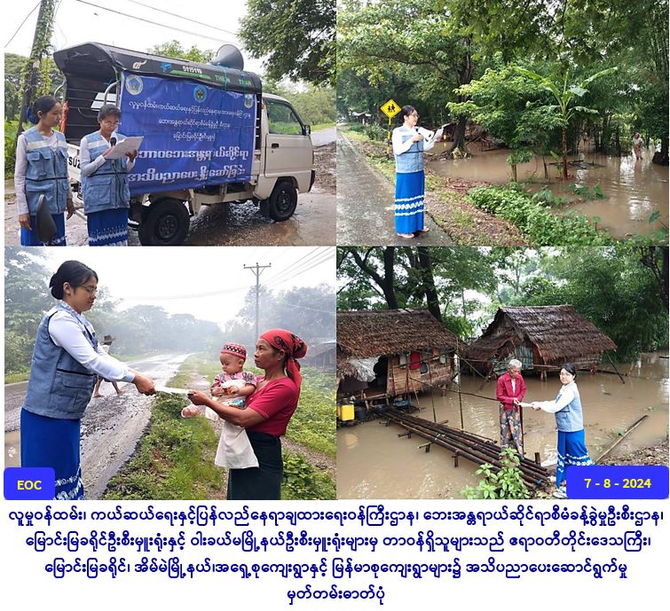လူမှု၀န်ထမ်း၊ ကယ်ဆယ်ရေးနှင့်ပြန်လည်နေရာချထားရေး၀န်ကြီးဌာန၊ ဘေးအန္တရာယ်ဆိုင်ရာစီမံခန့်ခွဲမှုဦးစီးဌာန၊ မြောင်းမြခရိုင်ဦးစီးမှူးရုံးနှင့် ဝါးခယ်မမြို့နယ်ဦးစီးမှူးရုံးများမှ တာဝန်ရှိသူများသည် (၇-၈-၂၀၂၄) ရက်နေ့တွင် အိမ်မဲမြို့နယ်၊ အရှေ့စုကျေးရွာနှင့် မြန်မာစုကျေးရွာများ၌ မိုးကြိုကာလအတွင်း ဖြစ်ပွားလေ့ရှိသော ရေဘေးနှင့် မြေပြိုဘေးအန္တရာယ်ဆိုင်ရာ ဆောင်ရန်/ရှောင်ရန် အချက်များအား ရပ်ကွက်၊ ကျေးရွာနေပြည်သူများသိရှိစေရန် လိုက်လံနှိုးဆော်အသိပညာပေးခြင်း၊ ဗီနိုင်းပိုစတာနှင့် လက်ကမ်းစာစောင်ဖြန့်ဝေပေးခြင်းများ ဆောင်ရွက်ခဲ့ပါကြောင်း သတင်းရရှိပါသည်။