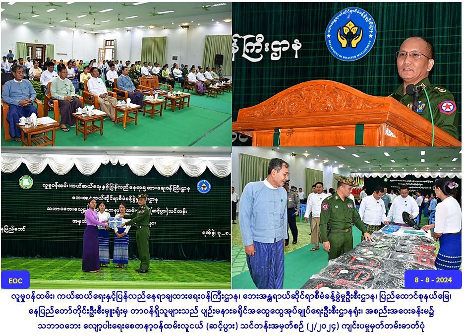 လူမှု၀န်ထမ်း၊ ကယ်ဆယ်ရေးနှင့်ပြန်လည်နေရာချထားရေး၀န်ကြီးဌာန၊ ဘေးအန္တရာယ်ဆိုင်ရာစီမံခန့်ခွဲမှုဦးစီးဌာန၊ ပြည်ထောင်စု နယ်မြေ၊ နေပြည်တော်တိုင်းဦးစီးမှူးရုံးမှ တာဝန်ရှိသူများသည် (၈-၈-၂၀၂၄) ရက်နေ့တွင် ပျဉ်းမနားခရိုင် အထွေထွေအုပ်ချုပ်ရေး ဦးစီးဌာနရုံး၊ အစည်းအဝေးခန်းမ၌ သဘာဝဘေးလျော့ပါးရေးစေတနာ့ ဝန်ထမ်းလူငယ် (ဆင့်ပွား) သင်တန်းအမှတ်စဉ် (၂/၂၀၂၄) အခမ်းအနားကို ကျင်းပပြုလုပ်ခဲ့ပြီး အဆိုပါ သင်တန်းအခမ်းအနားသို့ နေပြည်တော်ကောင်စီဝင်များဖြစ်ကြသည့် ဗိုလ်မှူးကြီး ရဲမိုး၊ ဦးဇေယျာလင်း၊ ဦးမြင့်စိုး၊ ဦးမင်းဦးနှင့် ဦးဟန်သူ၊ နေပြည်တော်စည်ပင်သာယာရေးကော်မတီ ဒုတိယမြို့တော်ဝန်၊ နေပြည်တော်အဆင့်ဌာနဆိုင်ရာများ၊ ဖိတ်ကြားထားသည့် ဧည့်သည်တော်များ၊ သင်တန်းသား၊ သင်တန်းသူများ စုစုပေါင်း (၇၀) ဦး တက်ရောက်ခဲ့ကြပါသည်။ သင်တန်းဖွင့်ပွဲအခမ်းအနား၌ နေပြည်တော်သဘာဝဘေးအန္တရာယ်ဆိုင်ရာစီမံခန့်ခွဲမှုလုပ်ငန်း ကော်မတီ ဥက္ကဋ္ဌ၊ နေပြည်တော်ကောင်စီဝင် ဗိုလ်မှူးကြီးရဲမိုးက အမှာစကားပြောကြားခဲ့ပြီး နေပြည်တော်သဘာဝဘေးအန္တရာယ် ဆိုင်ရာစီမံခန့်ခွဲမှုလုပ်ငန်းကော်မတီဥက္ကဋ္ဌ၊ နေပြည်တော်ကောင်စီဝင် ဗိုလ်မှူးကြီးရဲမိုးက သင်တန်းသား၊ သင်တန်းသူများအား သင်တန်းသုံးပစ္စည်းများ ပေးအပ်ခဲ့ပြီး နေပြည်တော်ဘေးအန္တရာယ်ဆိုင်ရာစီမံခန့်ခွဲရေးဦးစီးဌာန၊ တိုင်းဦးစီးမှူး ဦးစဝီလီဖရန့် က သင်တန်းဖွင့်လှစ်ရခြင်းနှင့်စပ်လျဉ်း၍ ရှင်းလင်းပြောကြားခဲ့ပါသည်။ သင်တန်းကာလမှာ (၇-၈-၂၀၂၄) ရက်နေ့မှ (၉-၈-၂၀၂၄) ရက် နေ့ထိ (၃)ရက်တာ ပို့ချသွားမည်ဖြစ်ပါကြောင်း သတင်းရရှိပါသည်။